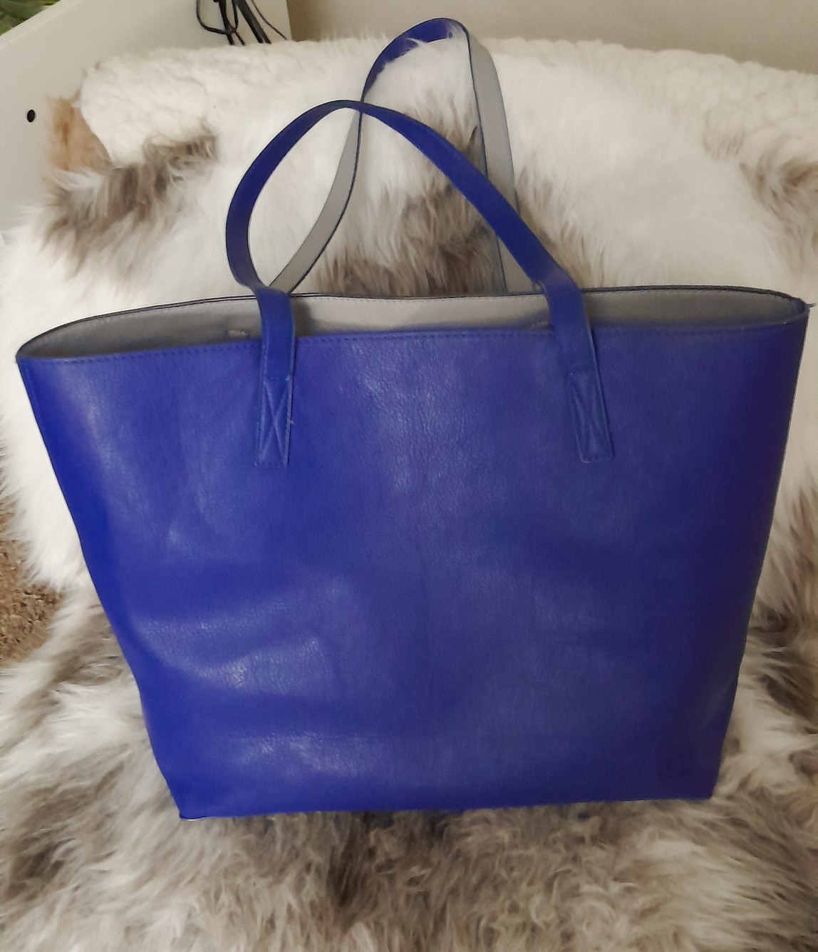 Large blue tote bag with grey straps and lining. Minor wear on the bottom corner. Colour is more of a royal blue.