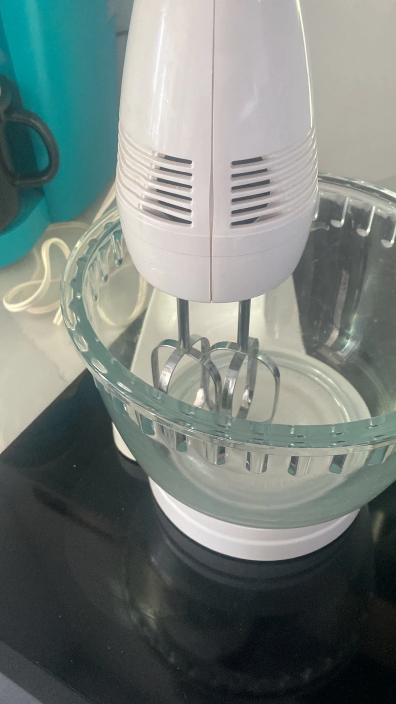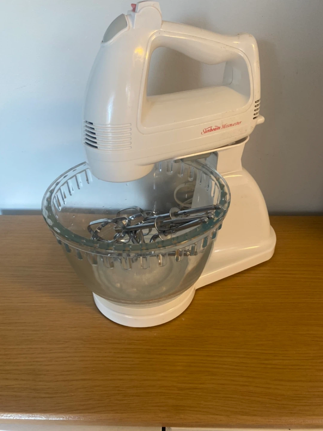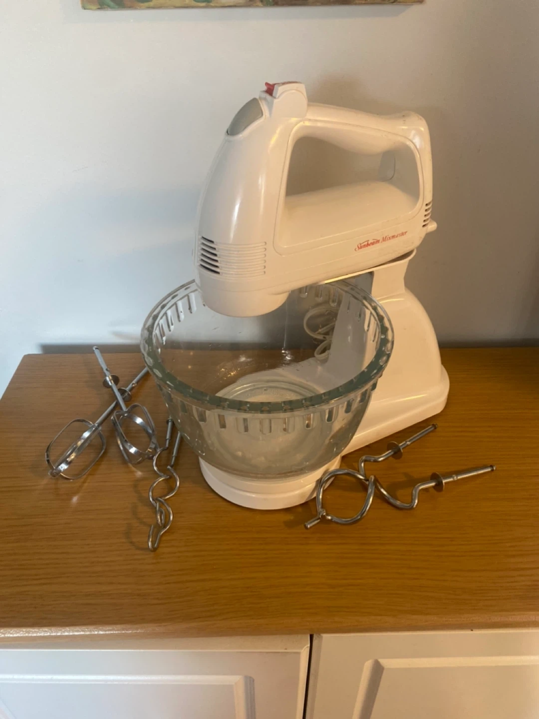 This is a white Sunbeam Mixmaster hand mixer. It comes with a clear glass bowl and multiple attachments for mixing. It's a classic kitchen appliance.