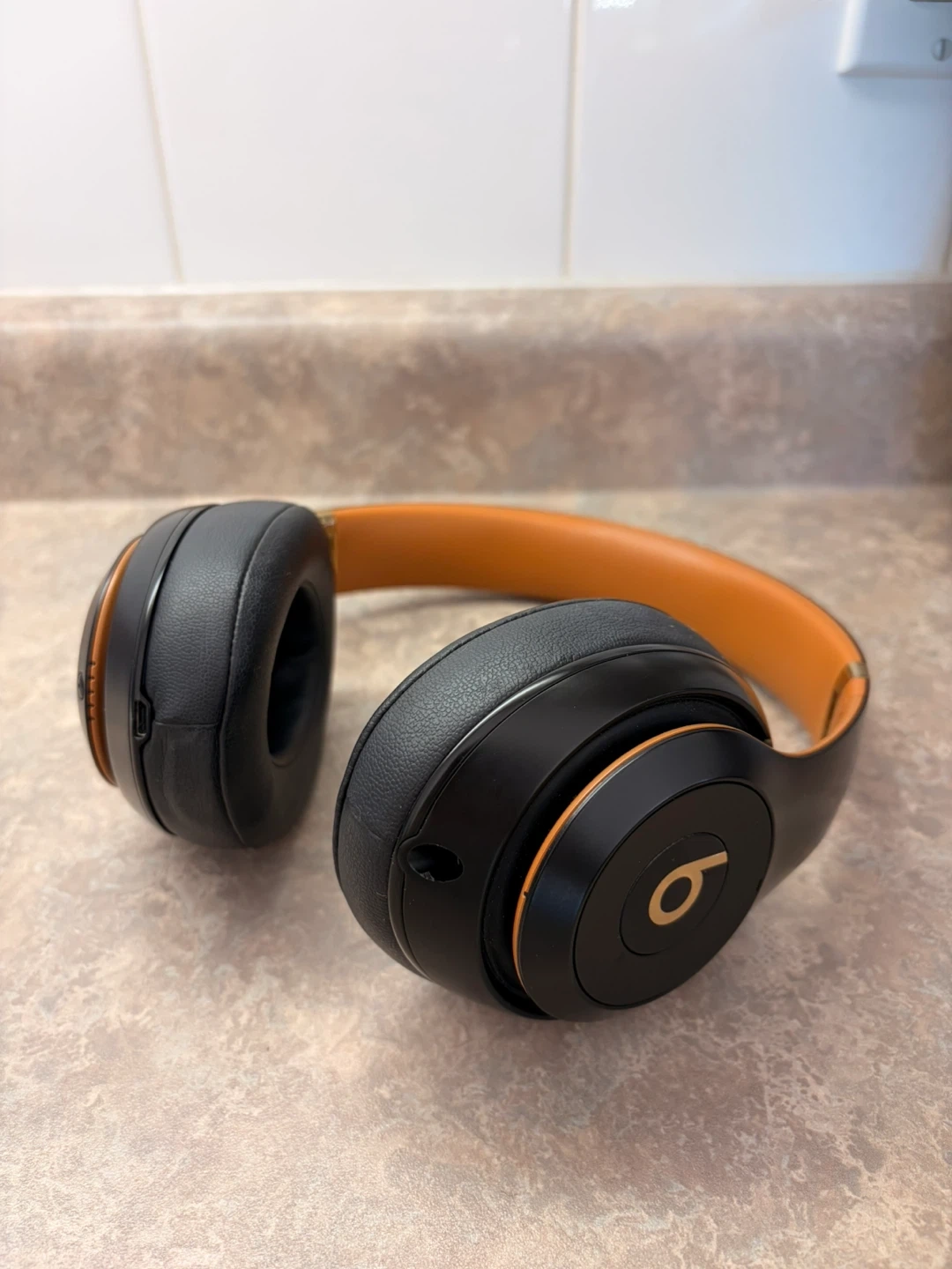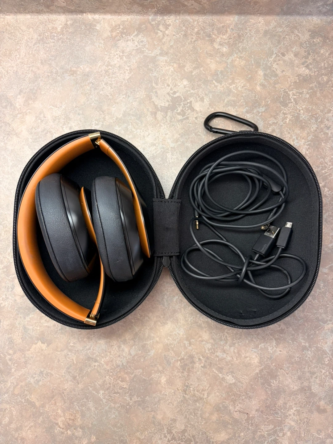 USED ONCE!! Beats Studio3 Wireless over-ear headphones in black with brown accents. Includes charging cable and carrying case.