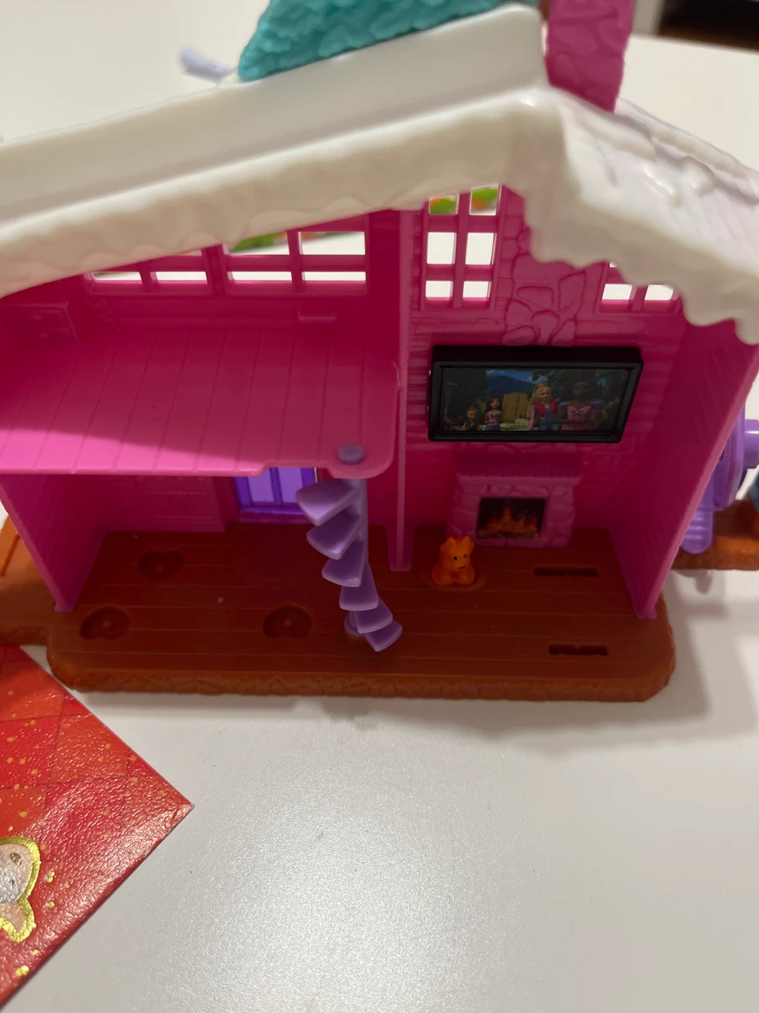 This is a fun pink dollhouse playset for kids. It features a small TV screen inside and a little fireplace. Includes a spiral staircase and a tiny orange figure.