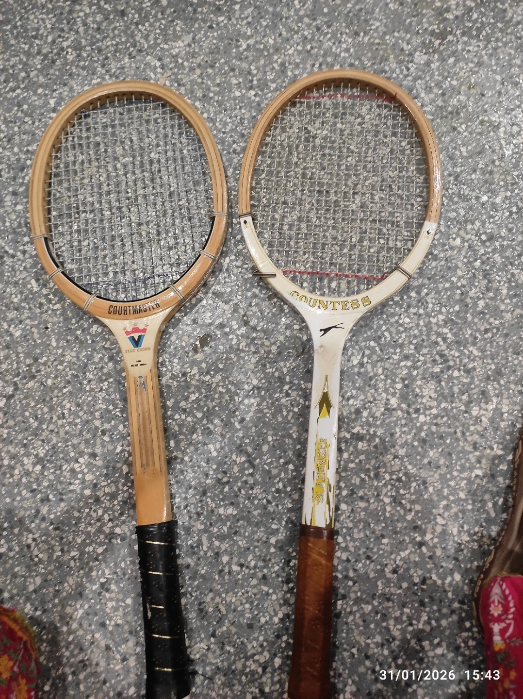 Two vintage wooden tennis rackets. One is a Courtmaster brand with a black grip. The other is a Slazenger Countess model with a wood-toned grip. Great for collectors or display!