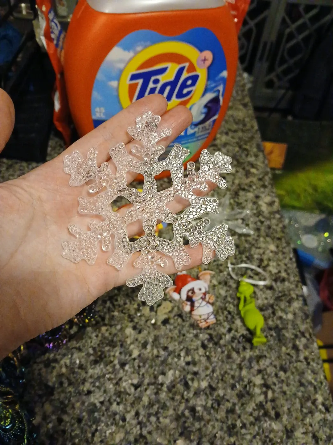 This is a clear snowflake ornament with a sparkly design. It's perfect for adding a festive touch to your Christmas tree or holiday decor. It's made of plastic material.