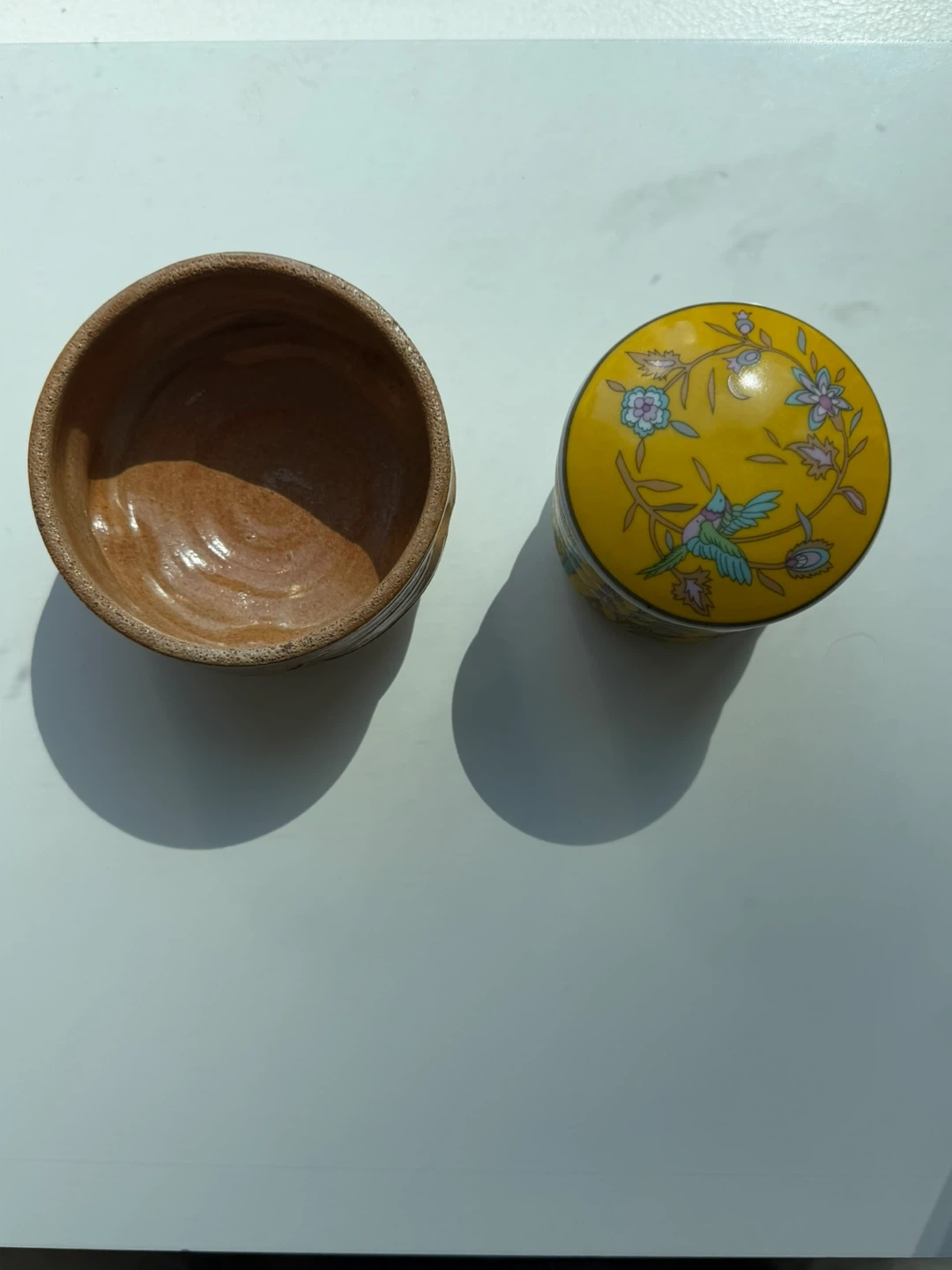 Set of small decorative yellow ceramic boxes with a floral and bird design. One lid is separate, and there are three stacked boxes. They're perfect for storing small jewelry or keepsakes!