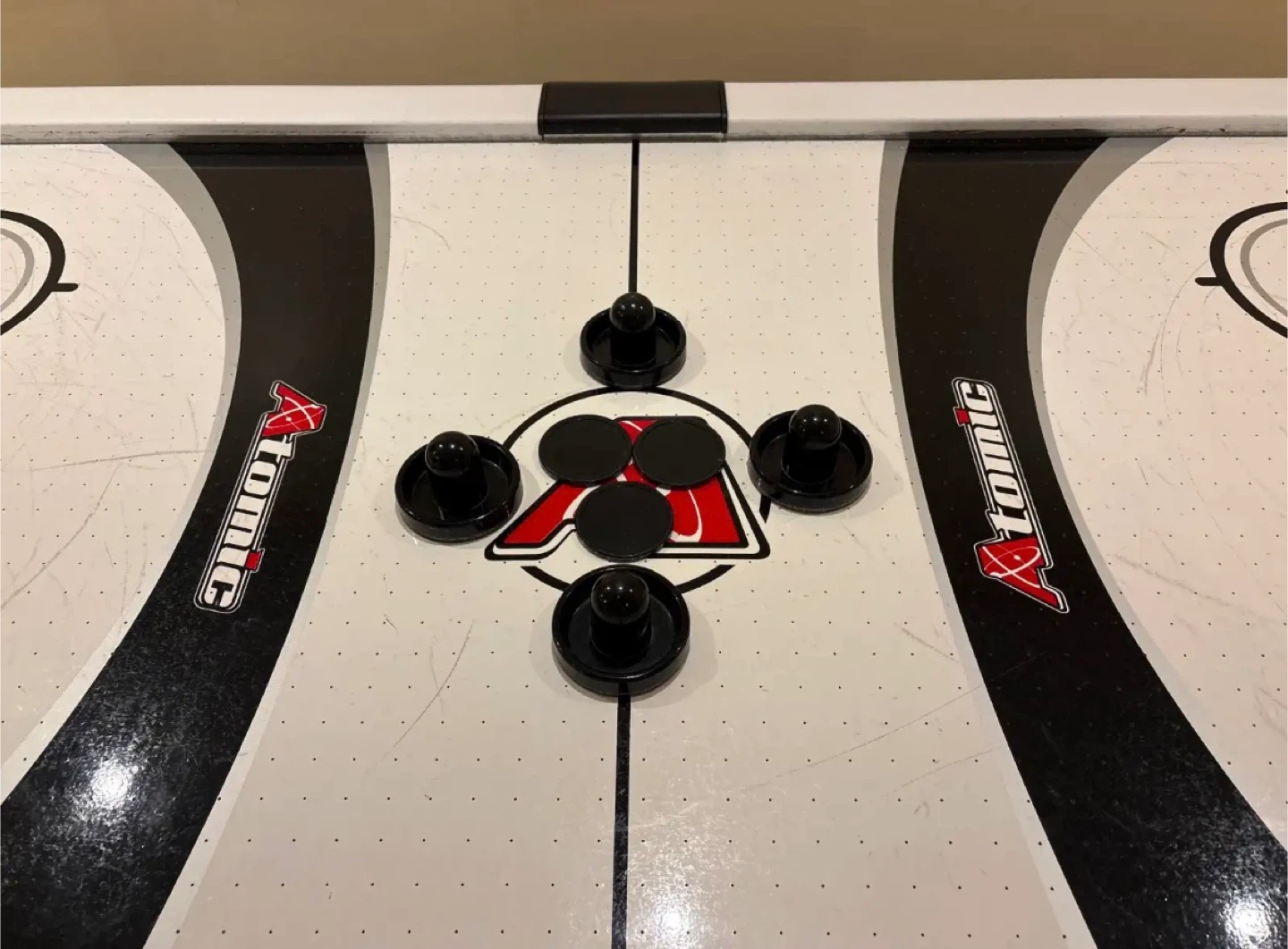 Selling a used Blazer Air Hockey Table (84in x 48in x 32in) in black and white. Works great and provides fast, smooth gameplay. Perfect for a basement, rec room, or game room. Used with some scratches from normal use, but overall in good condition. Electronic scoreboard dos not work but it does not affect how it plays. Comes with 3 pucks and 4 strikers.