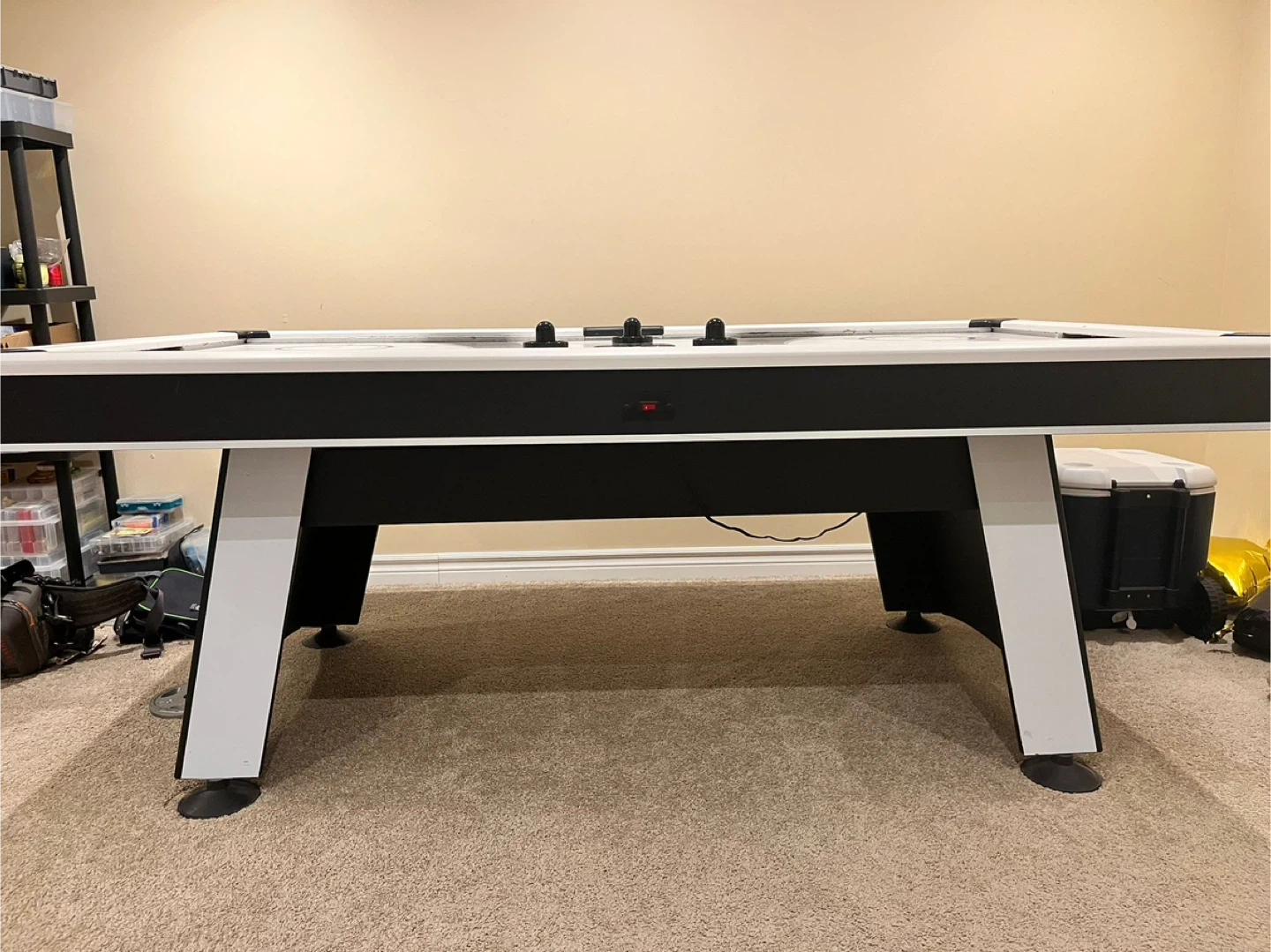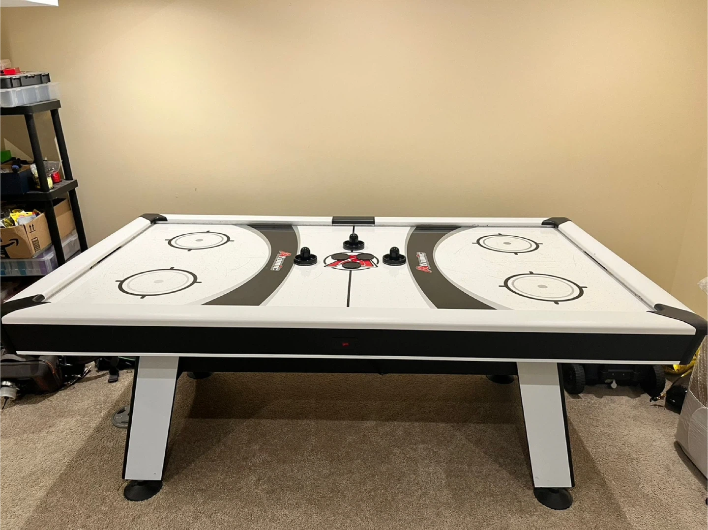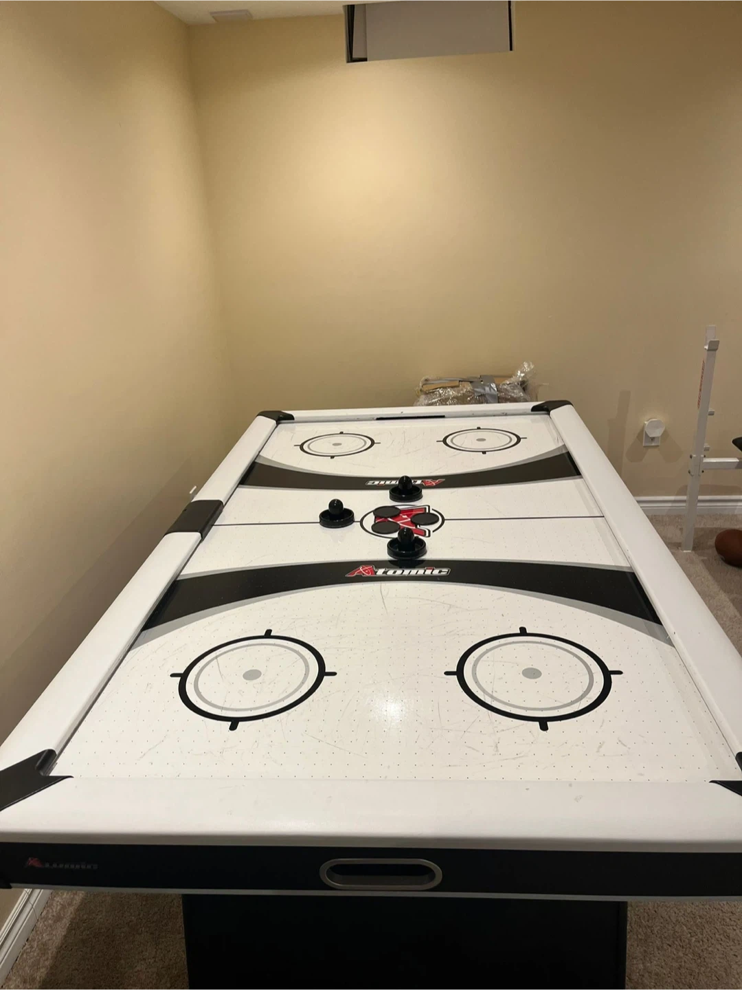 Selling a used Blazer Air Hockey Table (84in x 48in x 32in) in black and white. Works great and provides fast, smooth gameplay. Perfect for a basement, rec room, or game room. Used with some scratches from normal use, but overall in good condition. Electronic scoreboard dos not work but it does not affect how it plays. Comes with 3 pucks and 4 strikers.