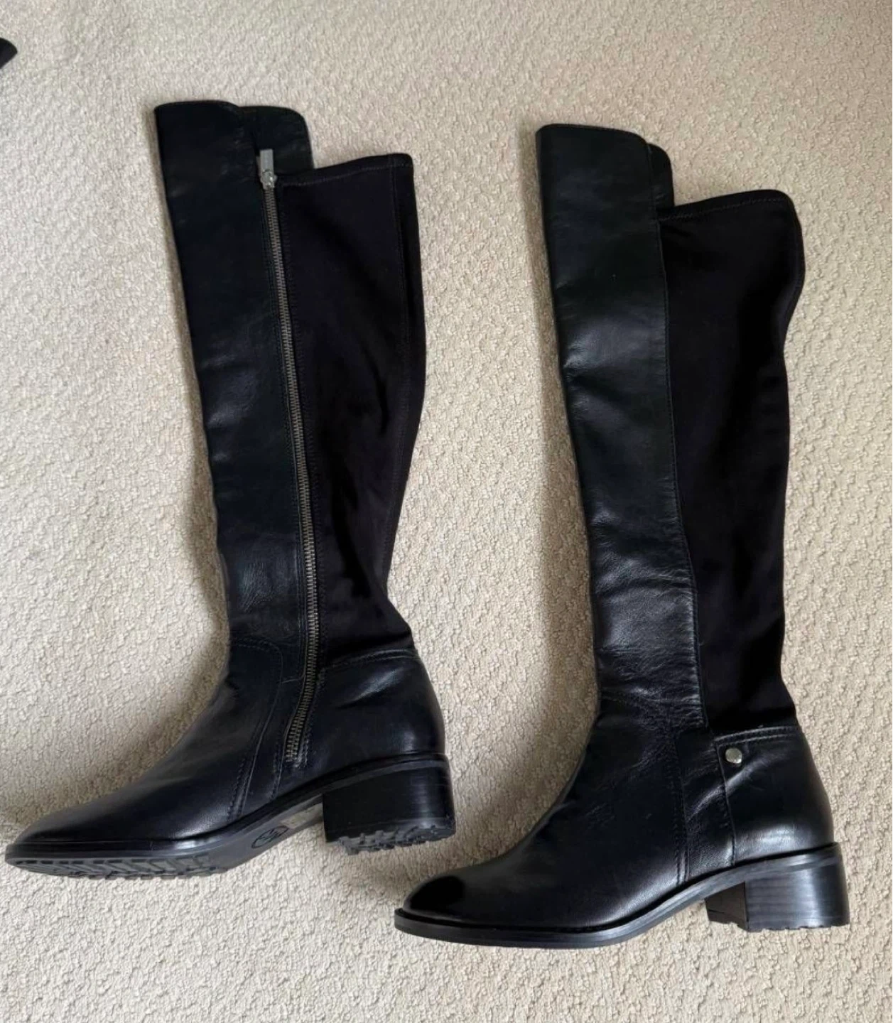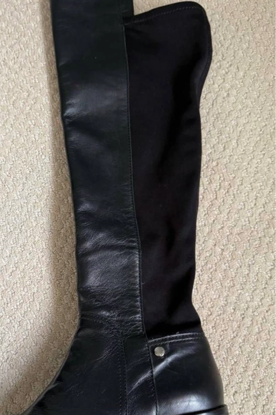 Stylish black knee-high boots from Michael Kors. Features a combination of leather and fabric upper with a durable rubber outsole. These boots are size 6.5.