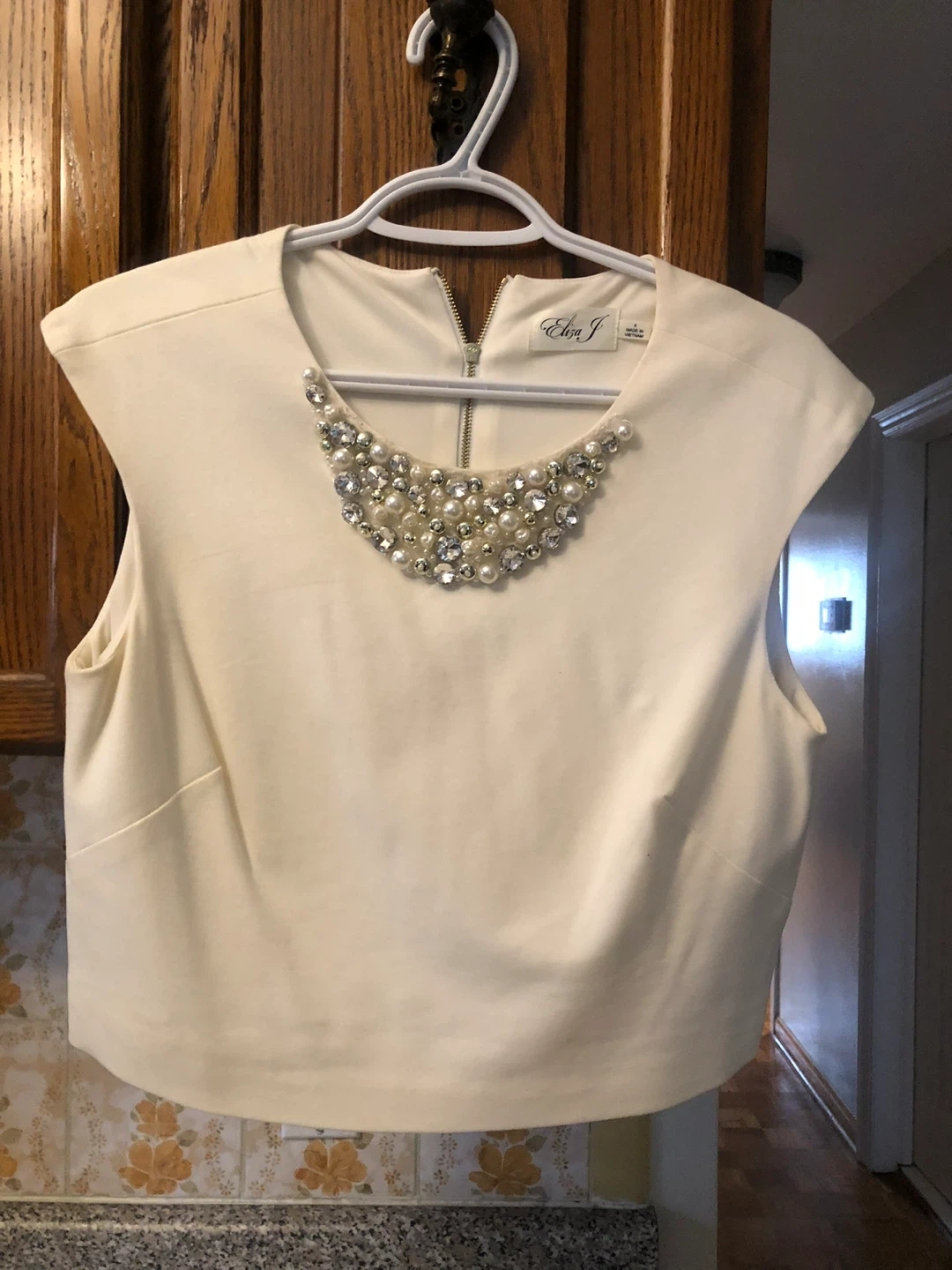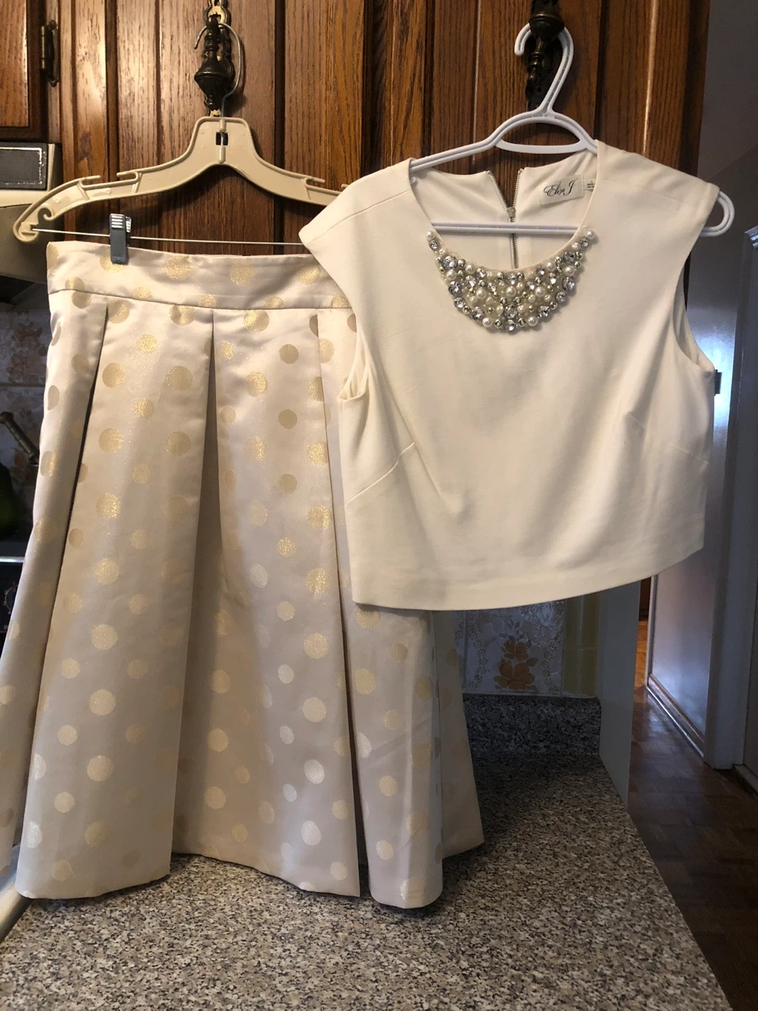 Selling a lovely two-piece set from Eliza J! It includes a cream-coloured top with pearl and rhinestone embellishments around the neckline, and a matching skirt with gold polka dots. Both are in perfect condition (only worn once). Perfect for a special occasion!