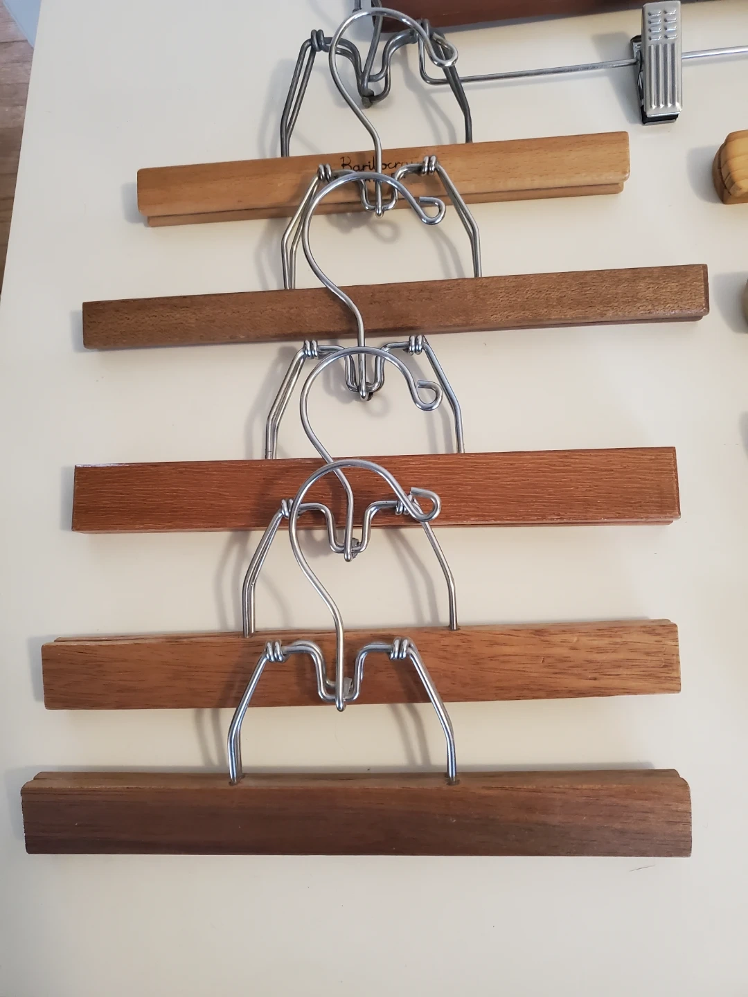 12 wooden hangers designed for pants and skirts. They feature a smooth wood finish and sturdy metal clips. Fully functional.