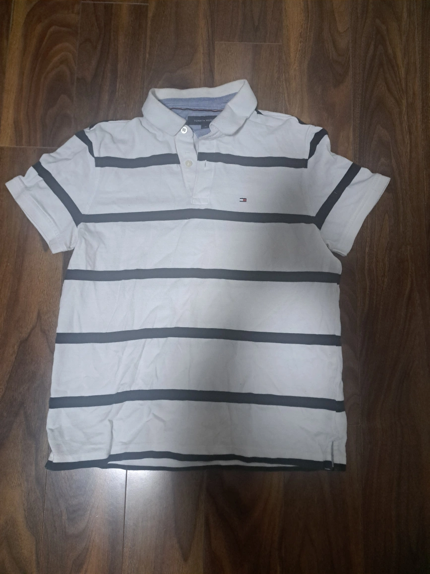 White polo shirt with dark grey horizontal stripes. Features a small Tommy Hilfiger flag logo on the chest. Made with a comfortable cotton blend.