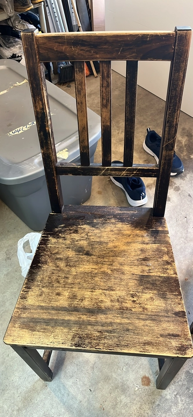 Three used wooden chairs. Dark brown/black finish. Some wear and scratches visible. Simple design, solid wood construction. Perfect for kitchen or dining room.