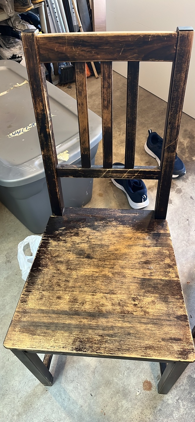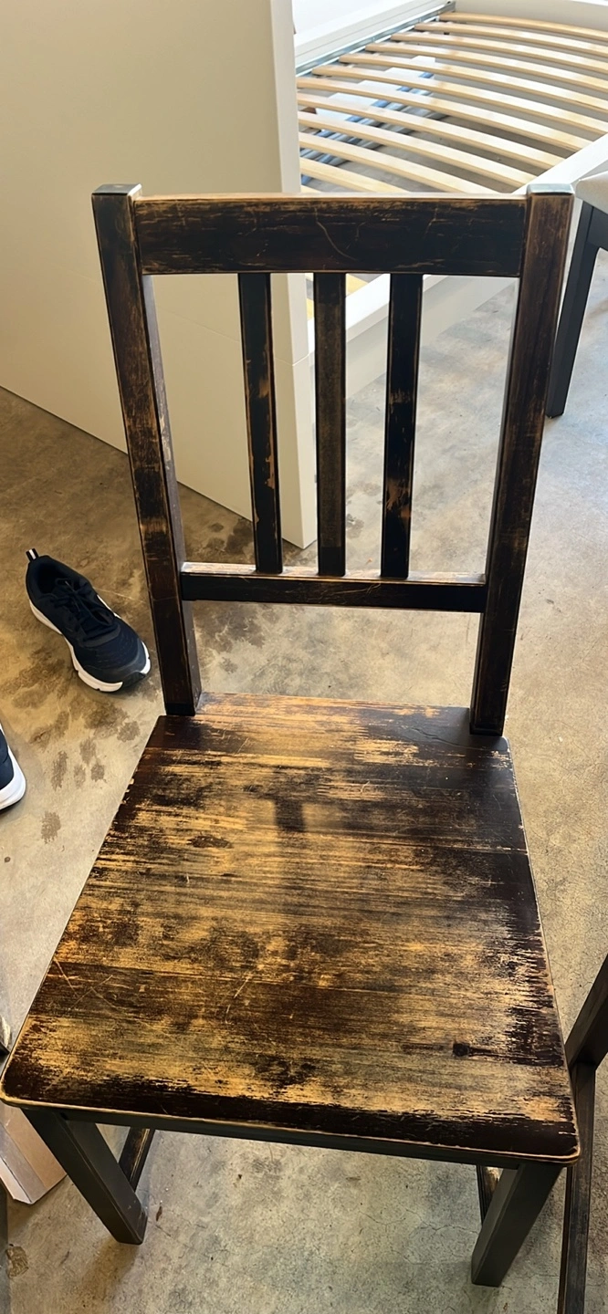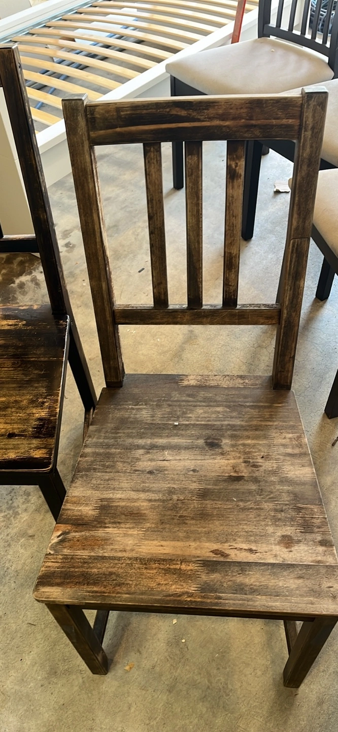 Three used wooden chairs. Dark brown/black finish. Some wear and scratches visible. Simple design, solid wood construction. Perfect for kitchen or dining room.