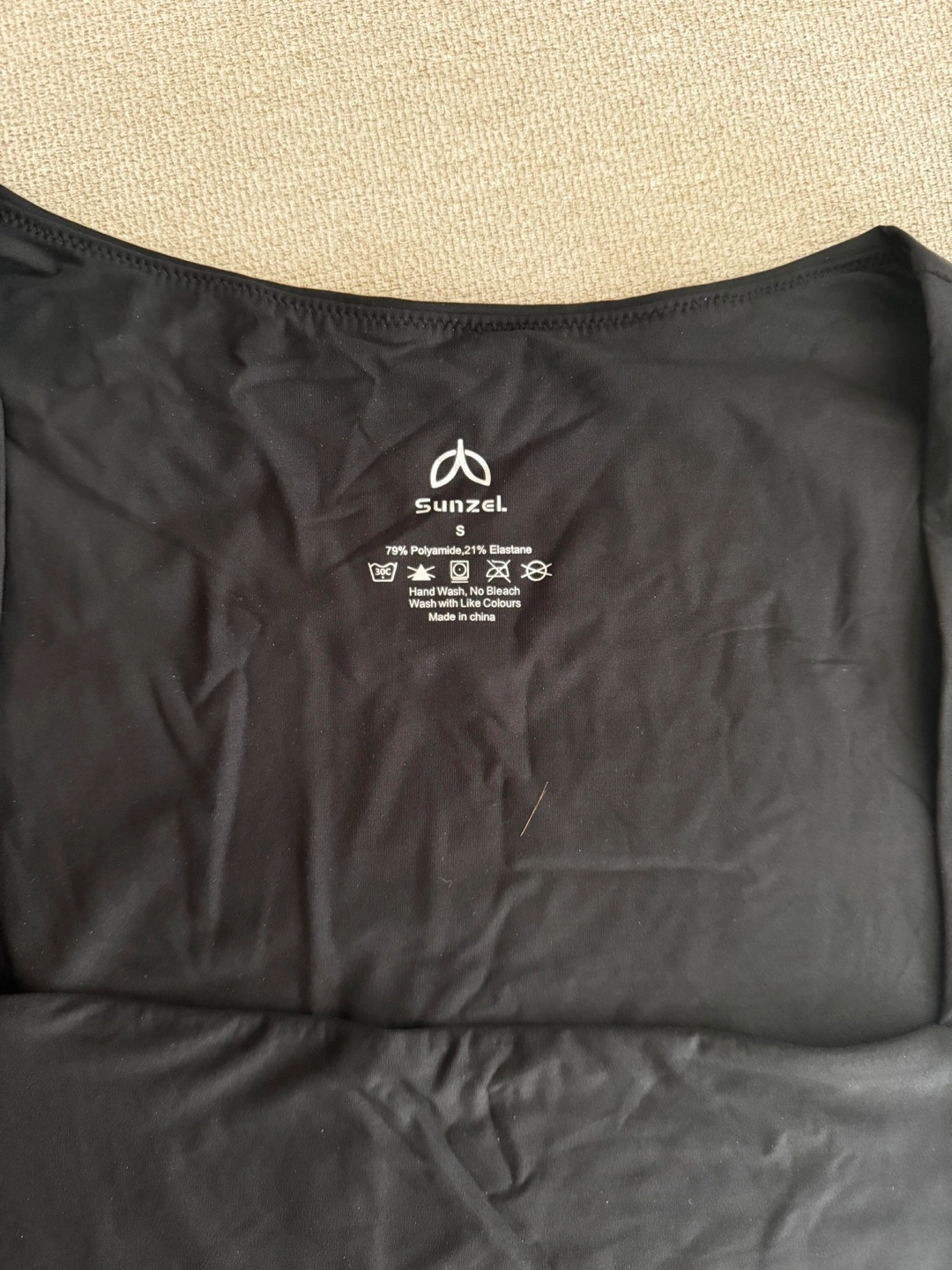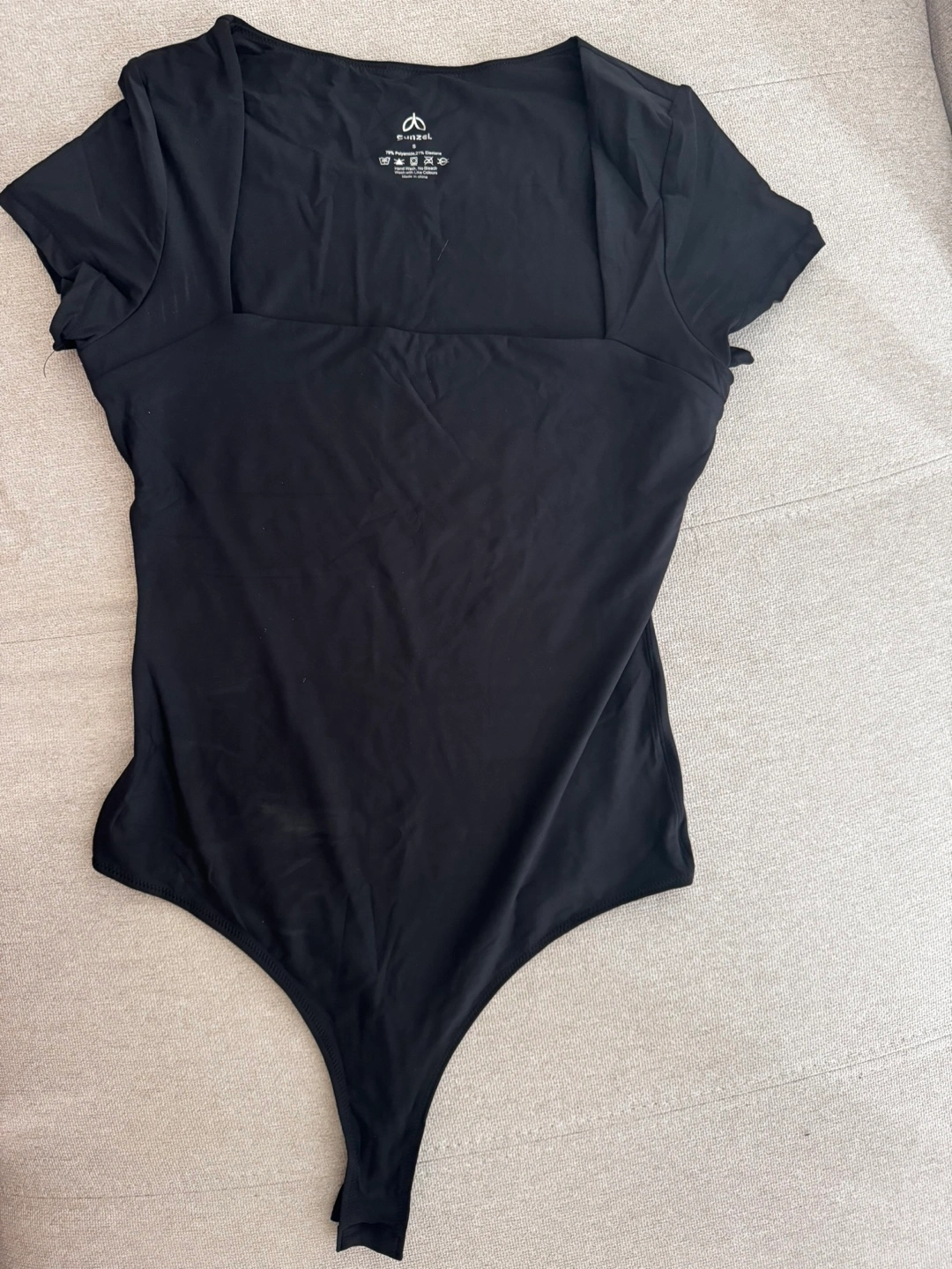 Black bodysuit, size small. Short sleeves, square neckline. 79% Polyamide, 21% Elastane. Hand wash.