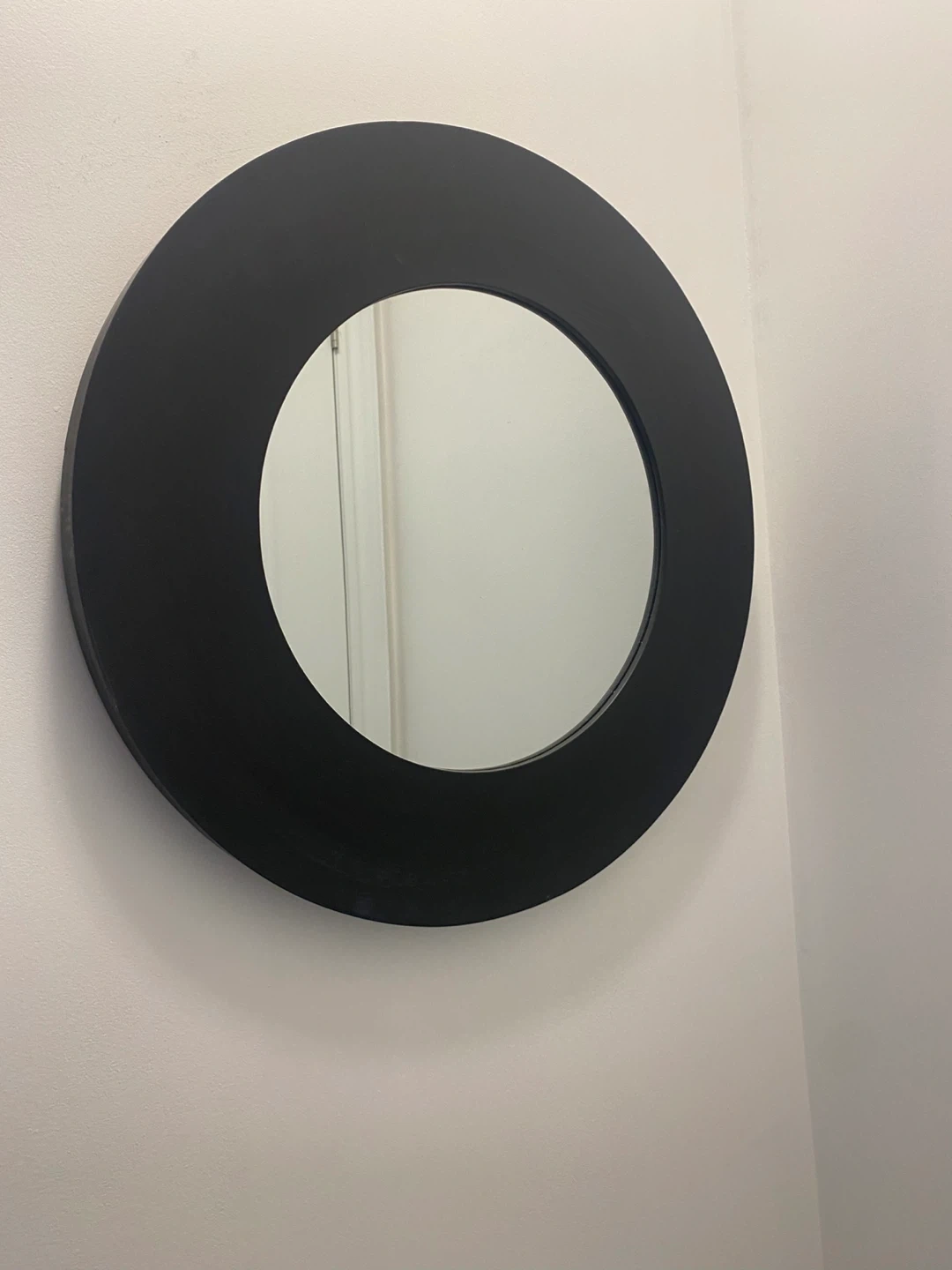 A stylish round mirror with a thick black frame. It's perfect for adding a decorative touch to any room. The mirror measures approximately 12 inches in diameter.