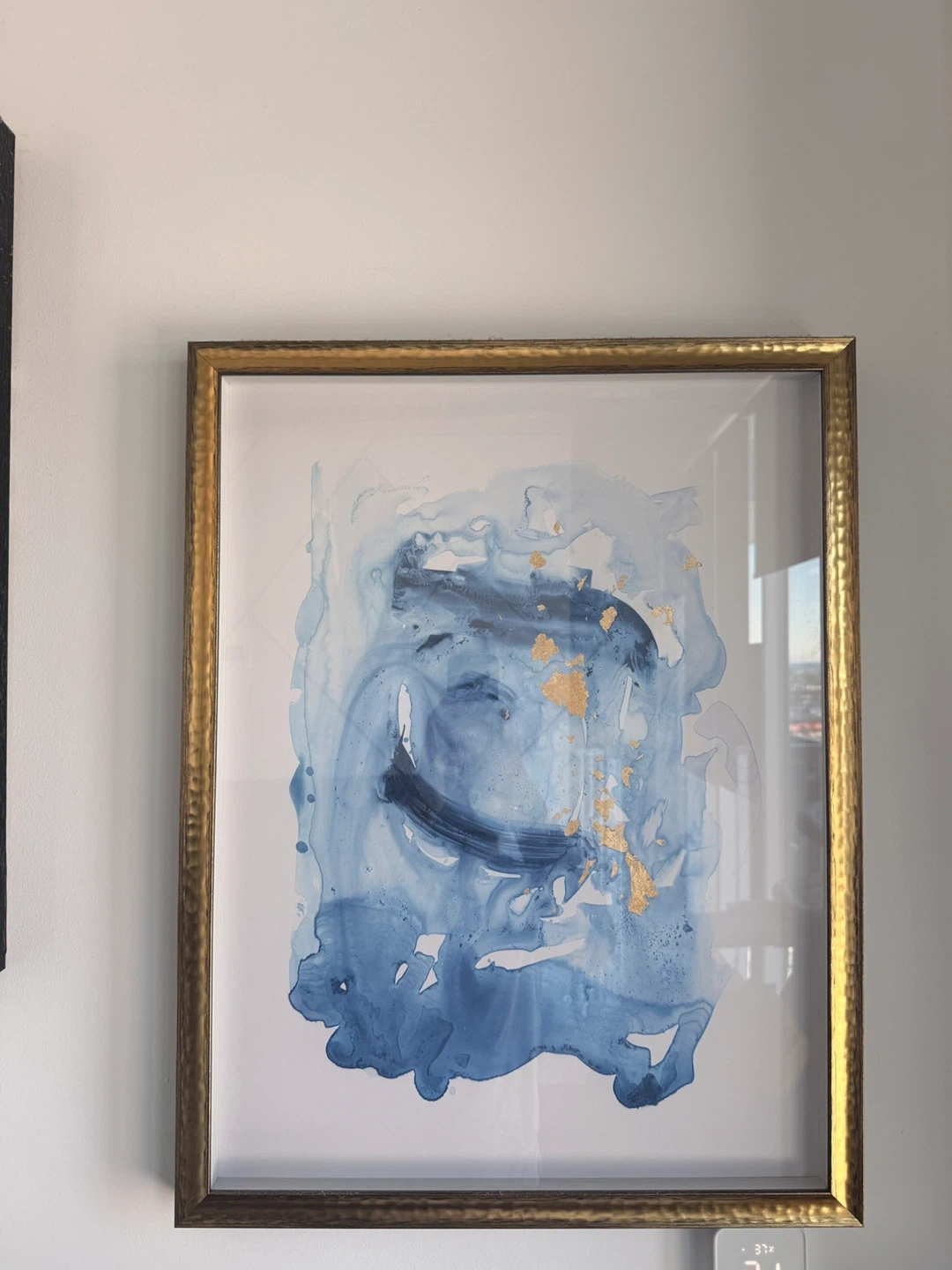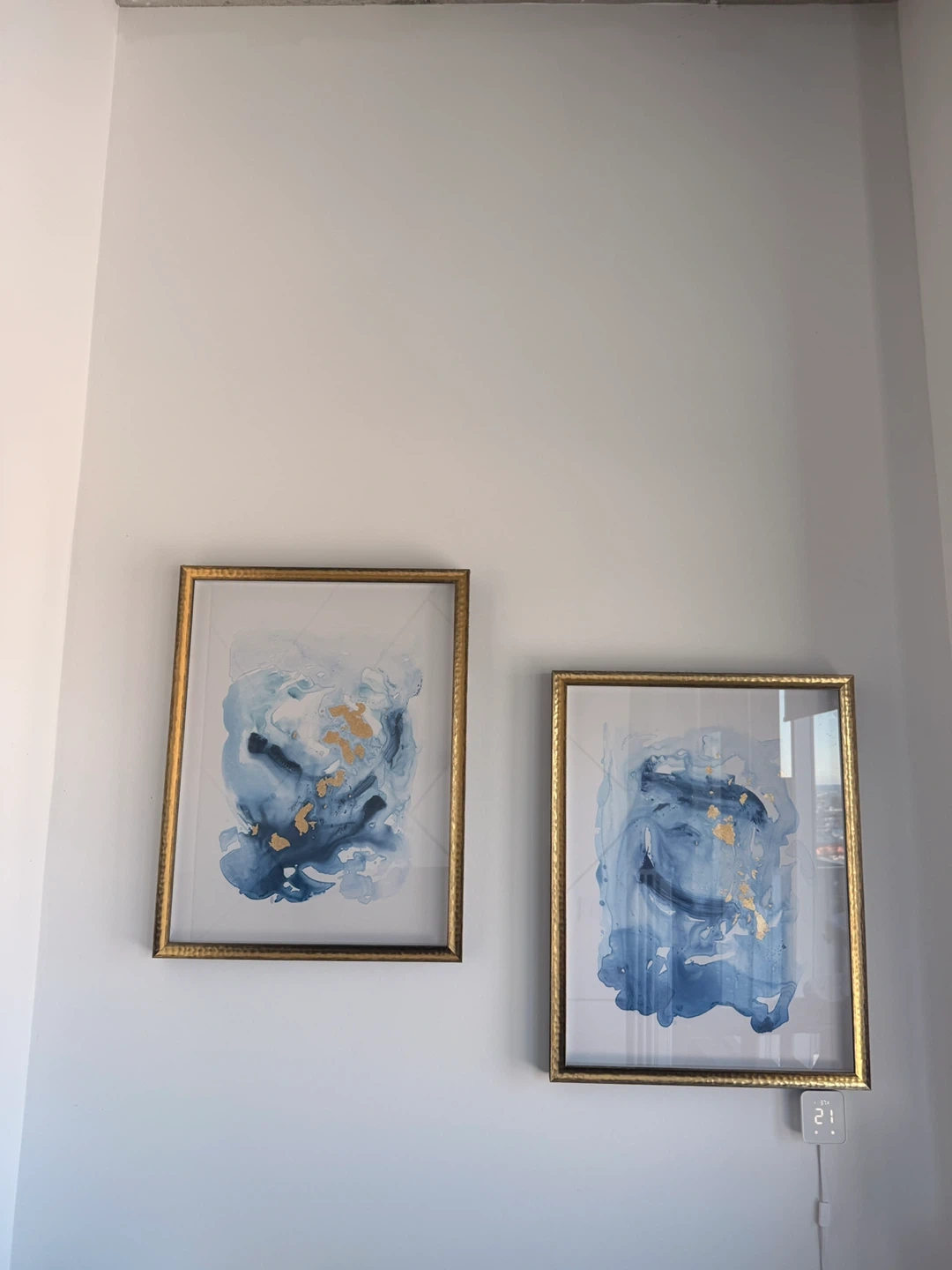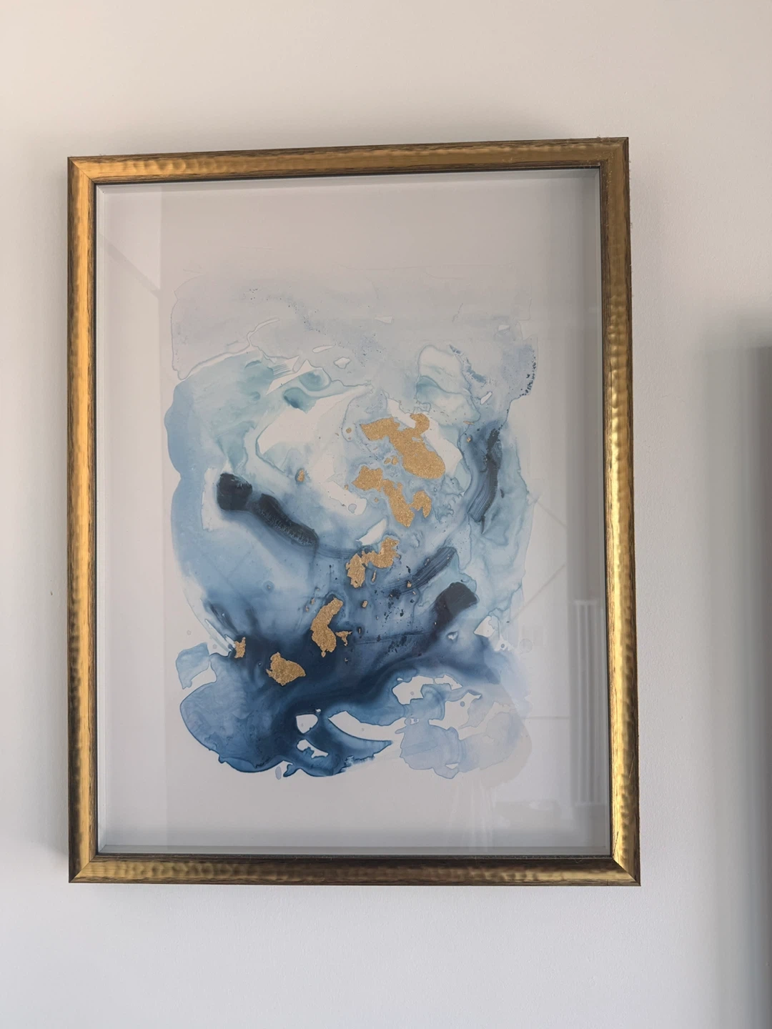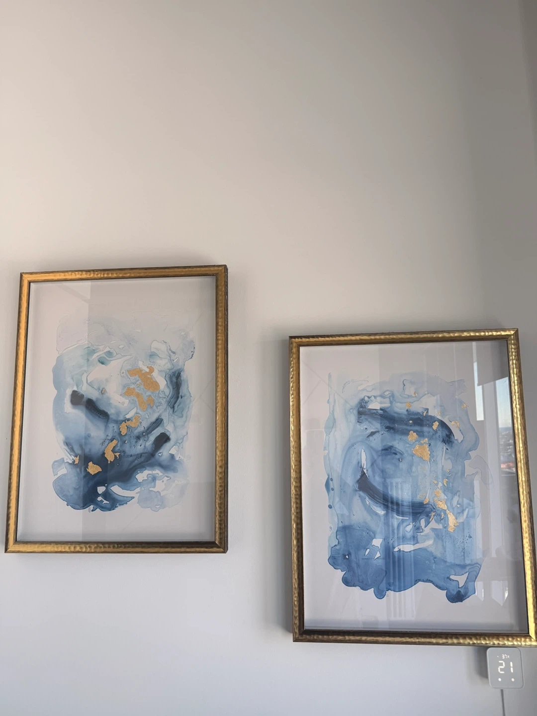 These framed abstract art prints feature beautiful blue watercolour designs with gold leaf accents. They're perfect for adding a touch of modern elegance to any room. The gold frames complement the artwork nicely.
