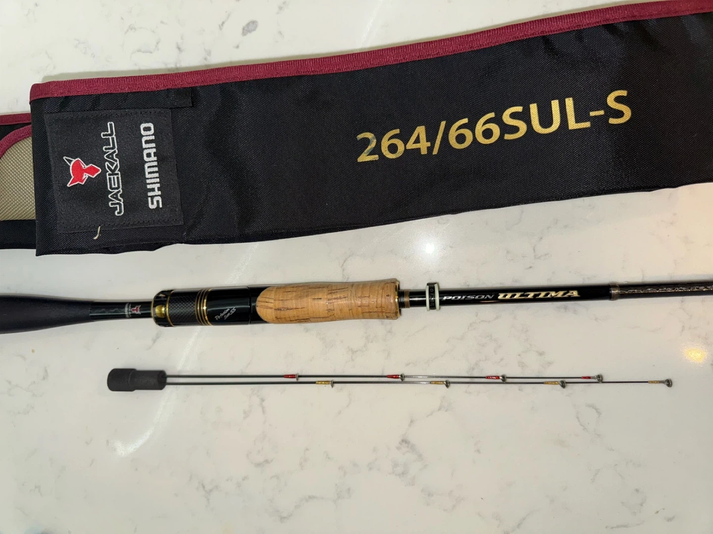 Selling a Shimano Jackall Poison Ultima 264/66SUL-S fishing rod! It features Hi-Power X Spiral X technology for enhanced performance. Comes with the original carrying case.