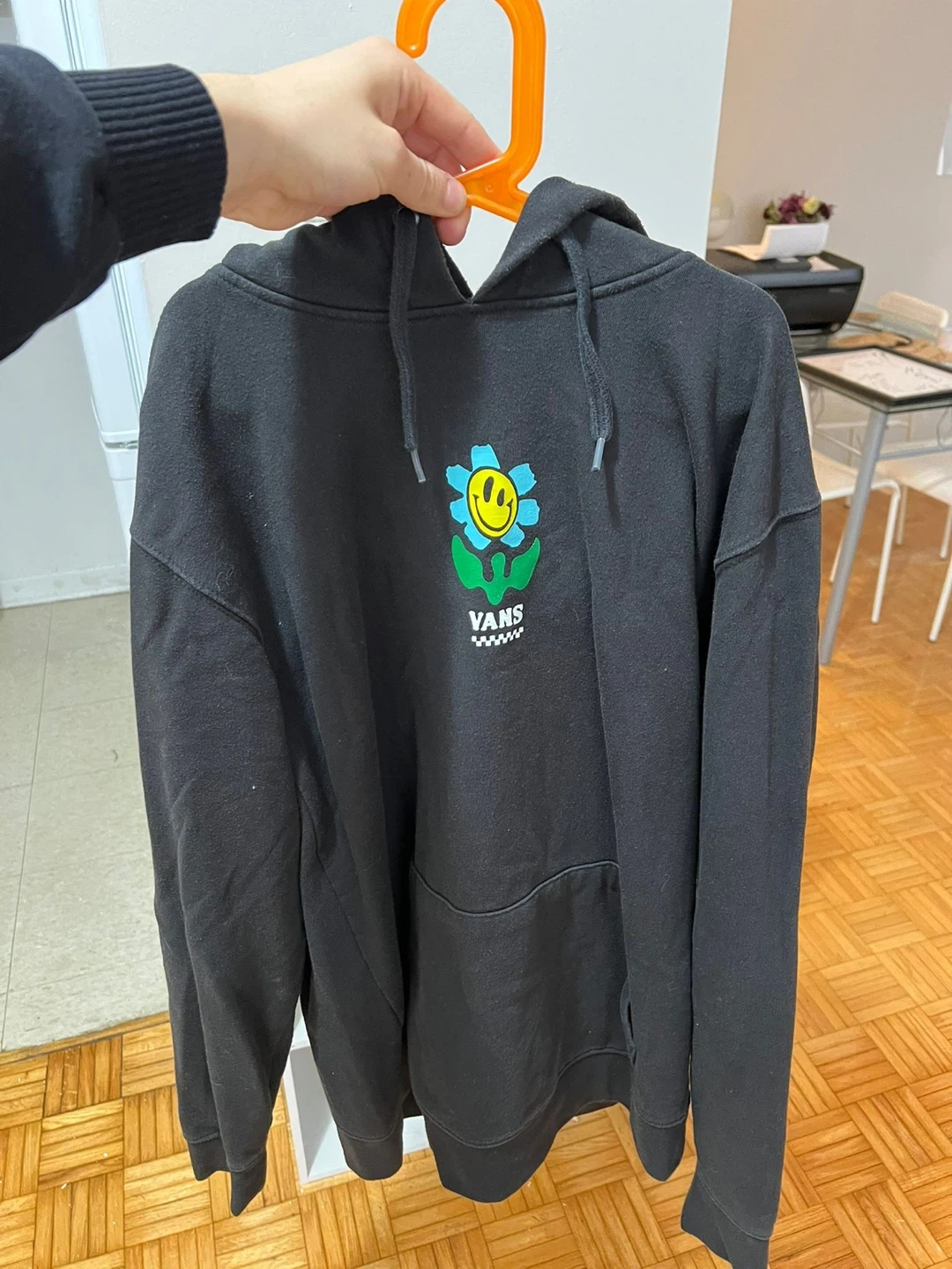 Black Vans hoodie with a smiley face, flower, and sun graphic on the front and back. It's made of a comfortable cotton blend. Great material, very warm and comfy.