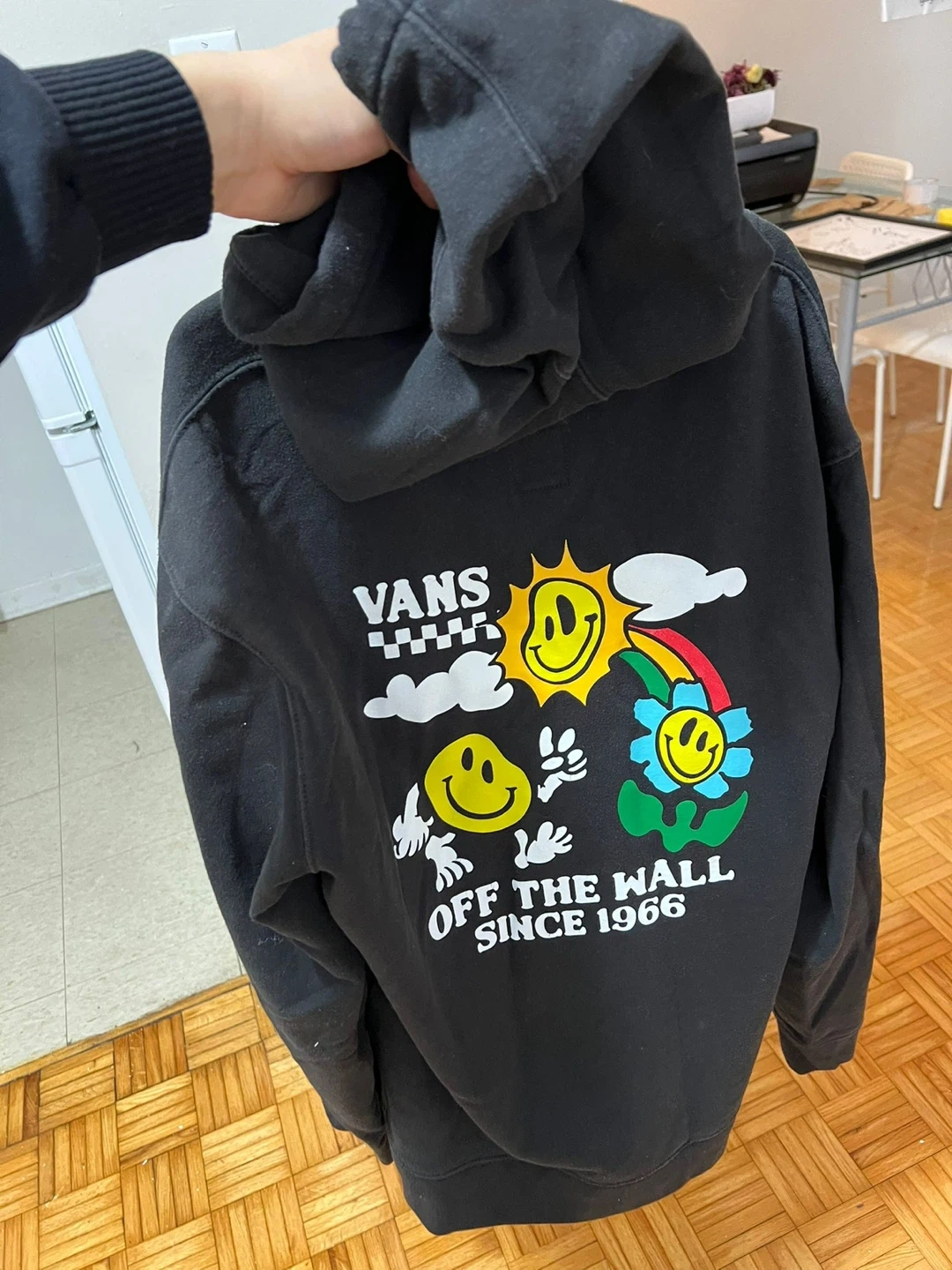Black Vans hoodie with a smiley face, flower, and sun graphic on the front and back. It's made of a comfortable cotton blend. Great material, very warm and comfy.