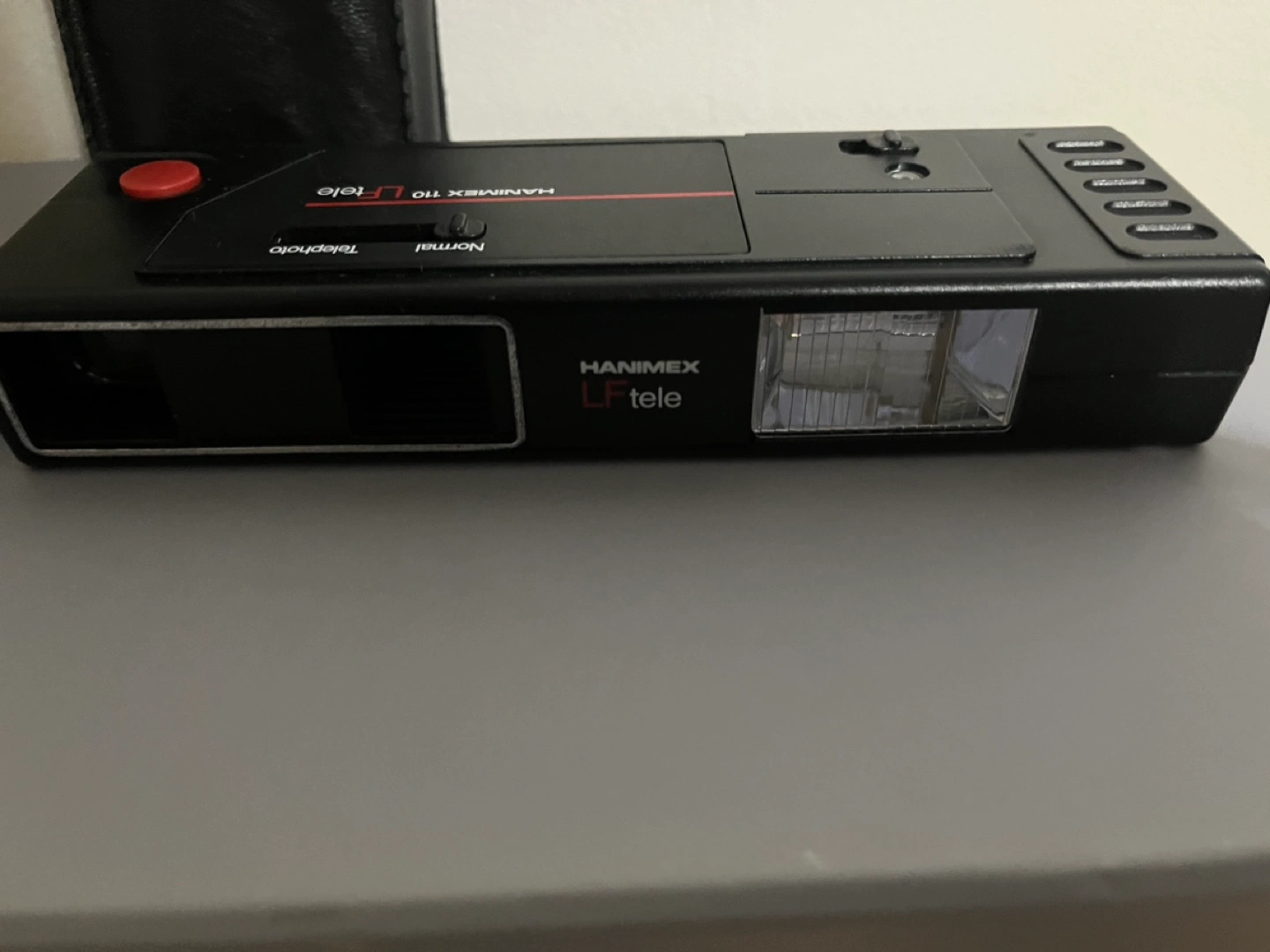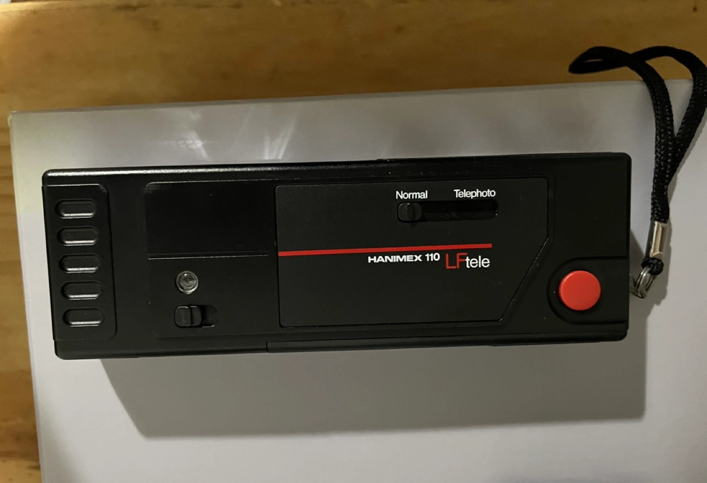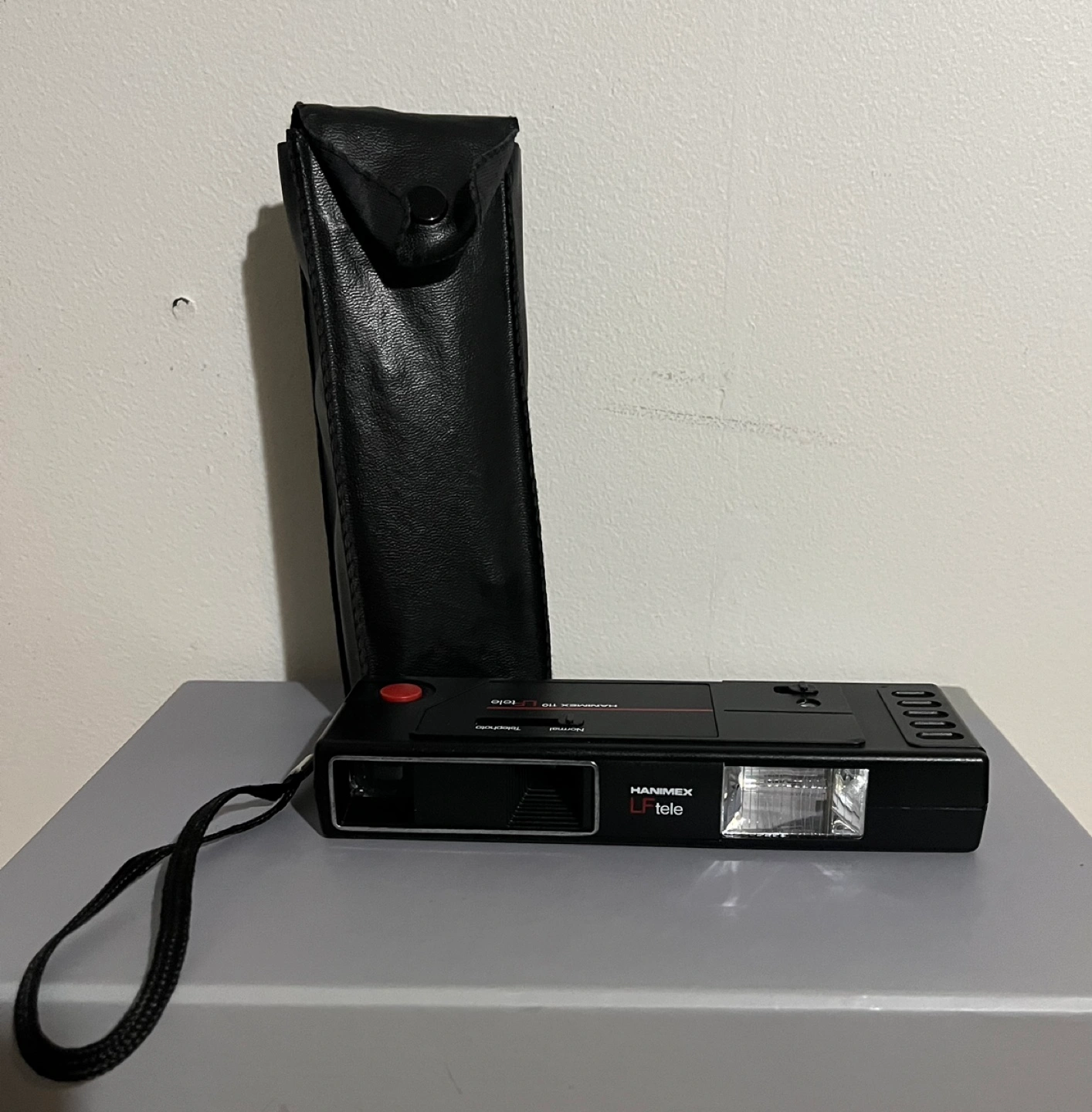 Vintage 110 film camera with built-in flash, lens cover, and a carrying case. Includes a wrist strap.