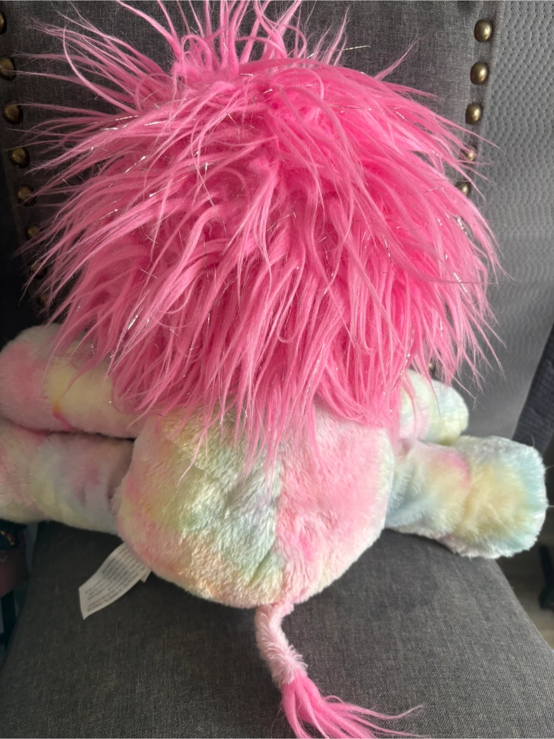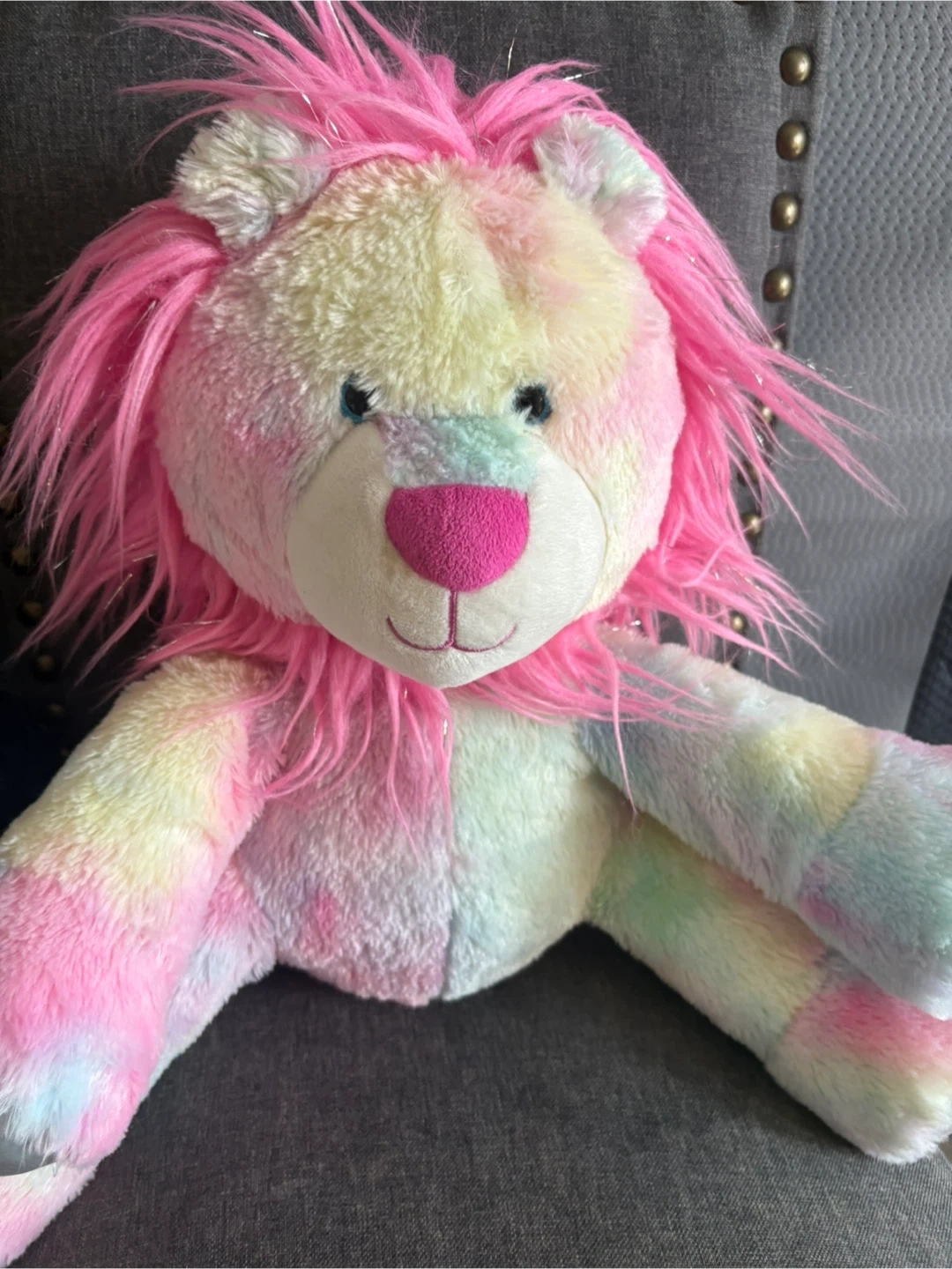 Selling a cute rainbow lion plush! It's in great condition and ready for a new home. This colourful lion has a vibrant pink mane and tail, and a soft, huggable body in pastel rainbow colours.