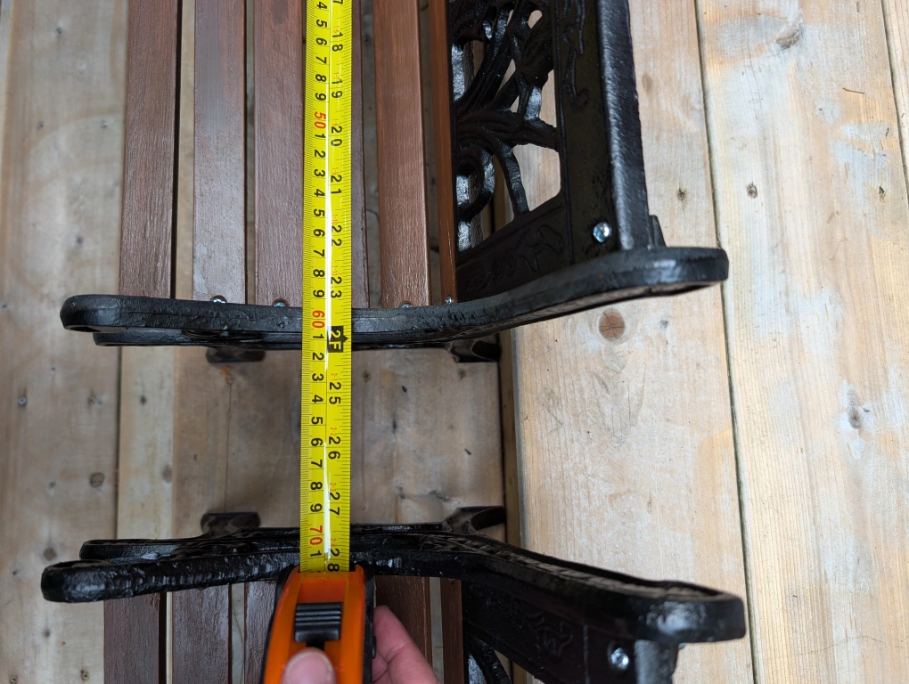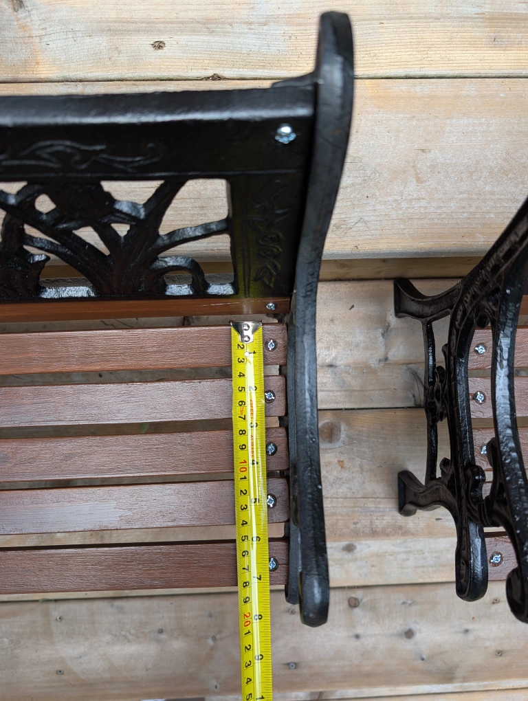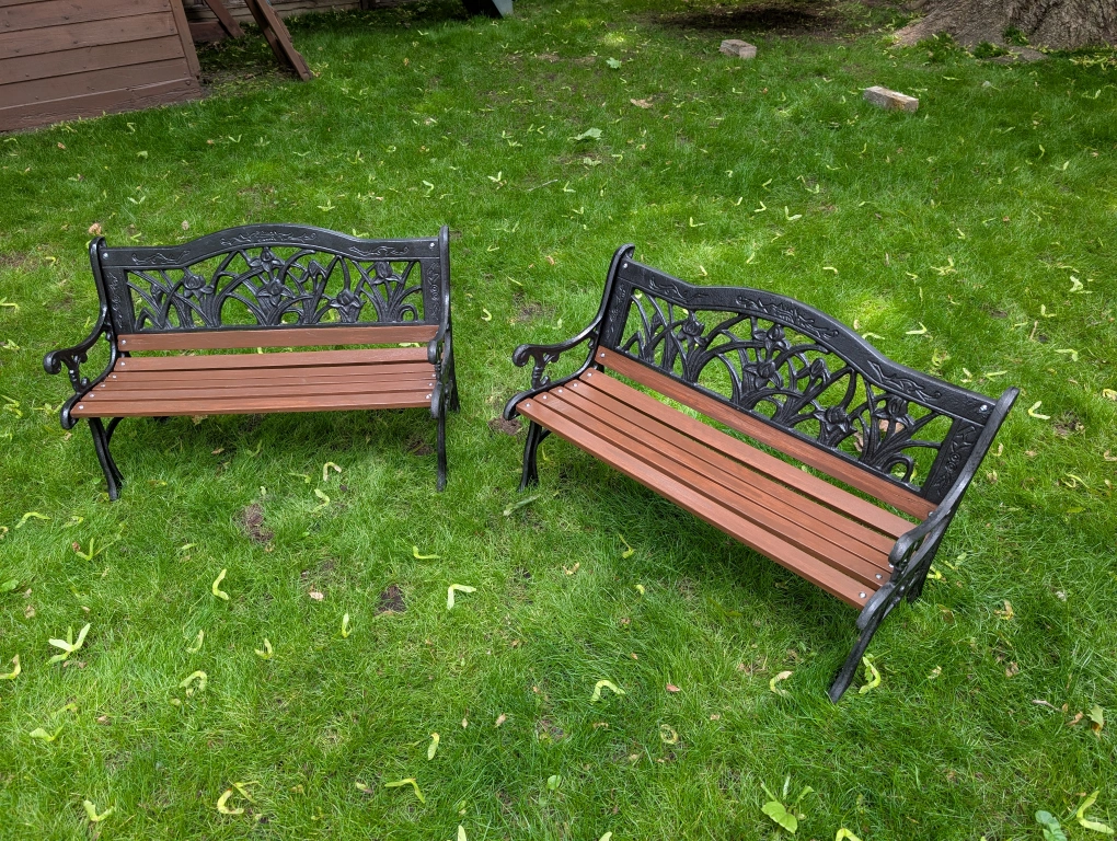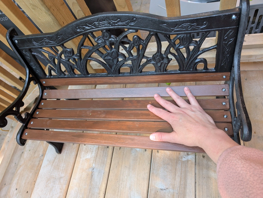 Black cast iron and wooden slats.