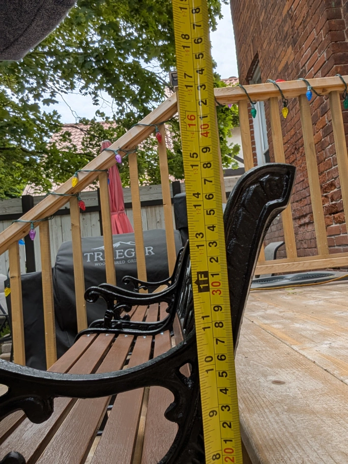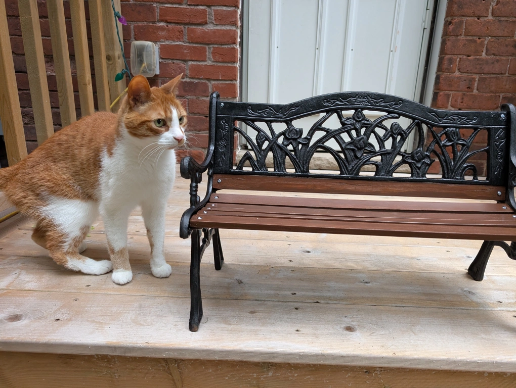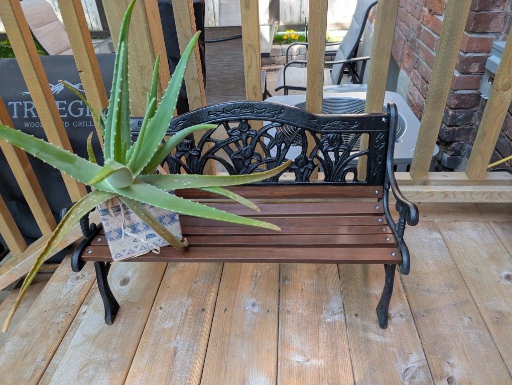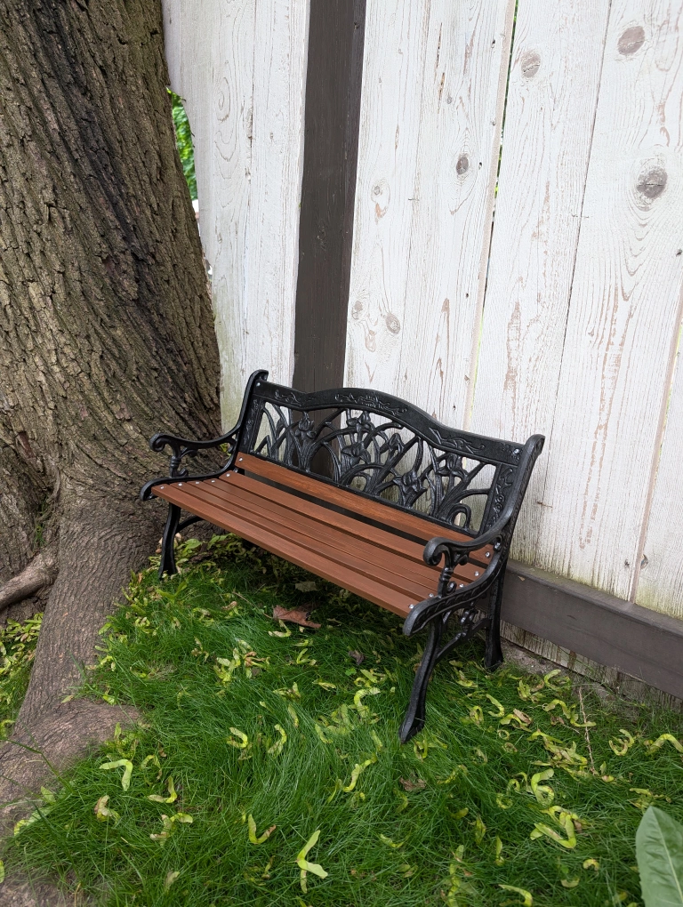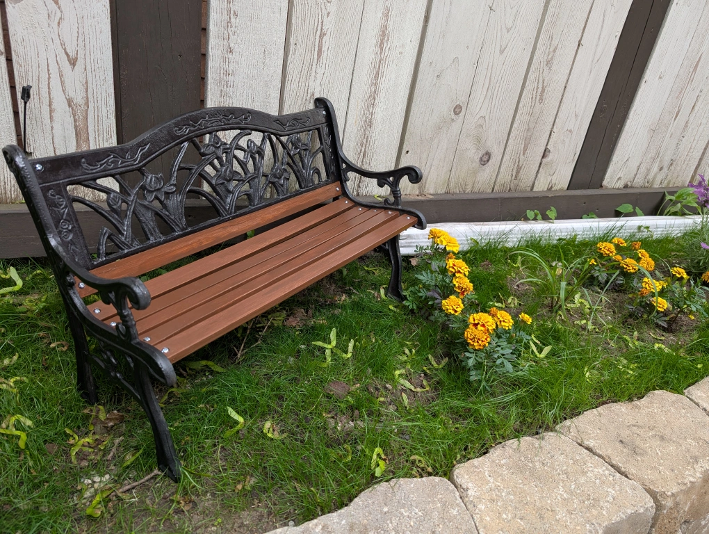 Black cast iron and wooden slats.
