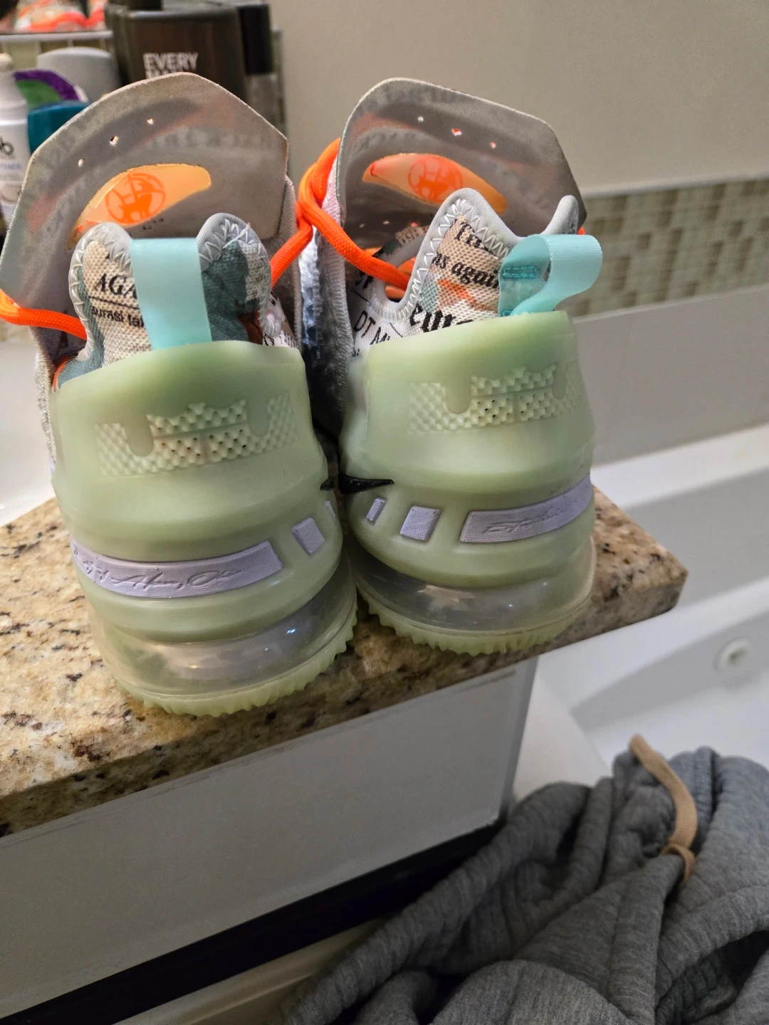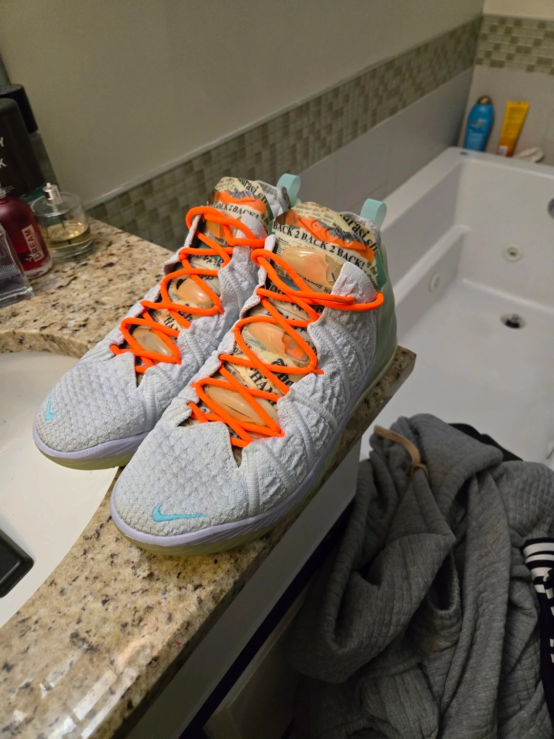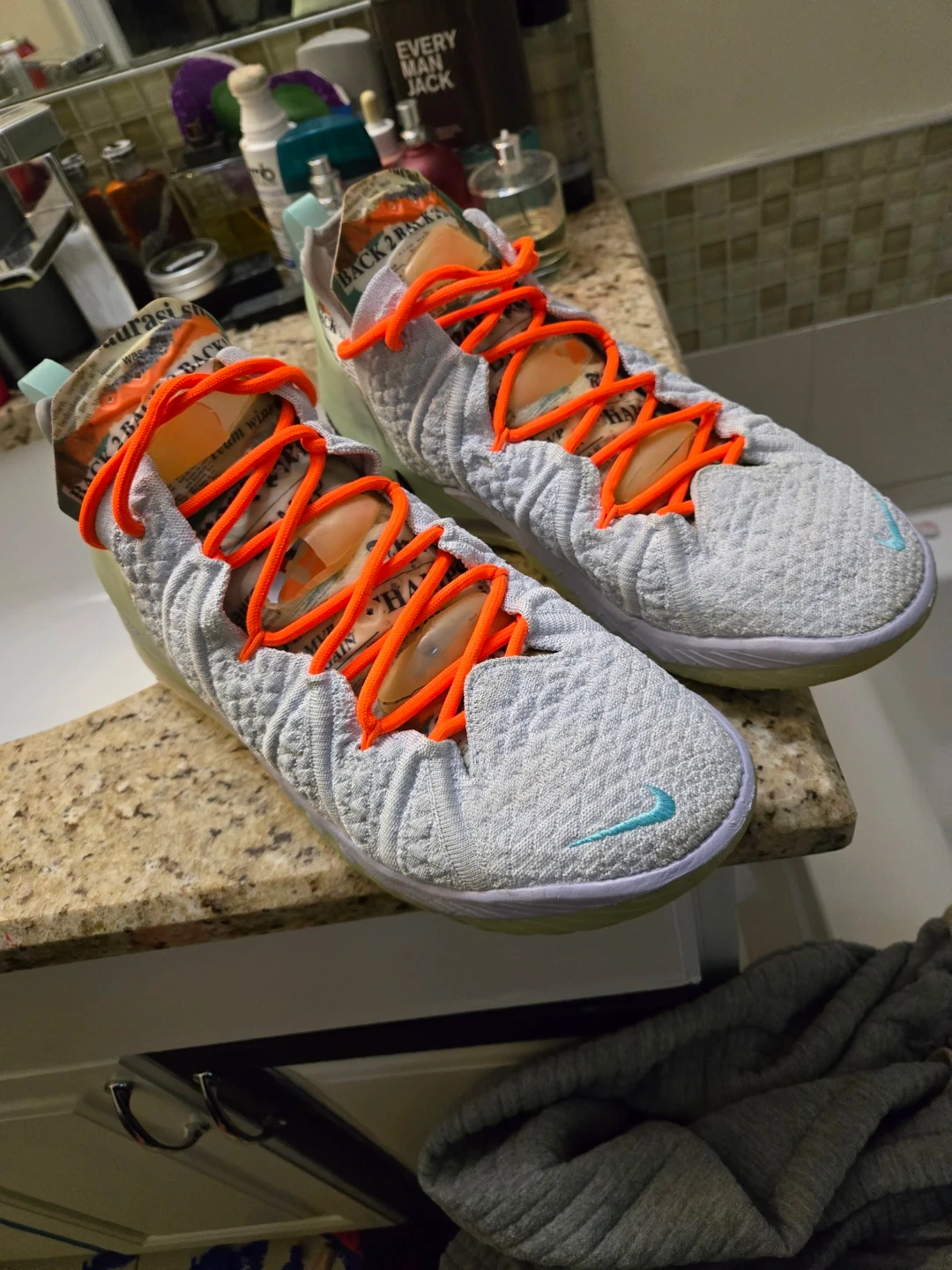These Nike LeBron 18 Low sneakers feature a white and grey knit upper with bright orange laces. The outsole has a light purple and green accent. They're super comfortable and stylish for everyday wear! Size 10-11