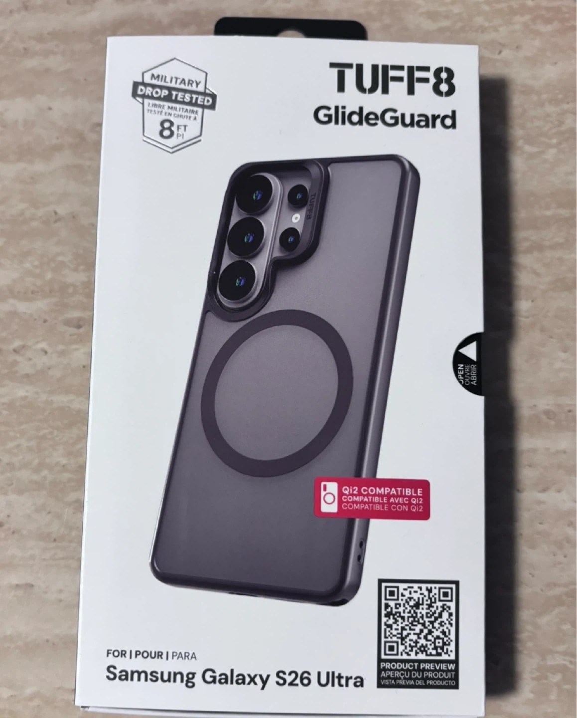 This TUFF8 GlideGuard case offers military-grade drop protection tested up to 8 feet. It's Qi2 compatible and designed with raised edges for added screen protection. Slim profile design.