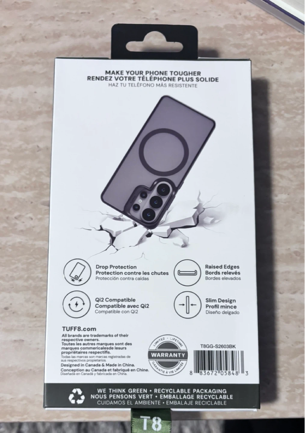 This TUFF8 GlideGuard case offers military-grade drop protection tested up to 8 feet. It's Qi2 compatible and designed with raised edges for added screen protection. Slim profile design.