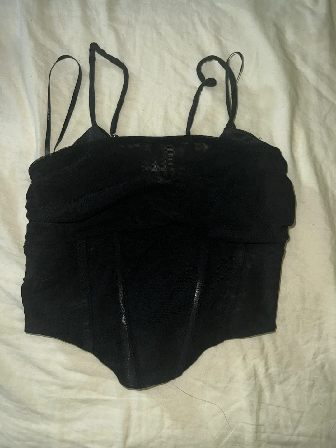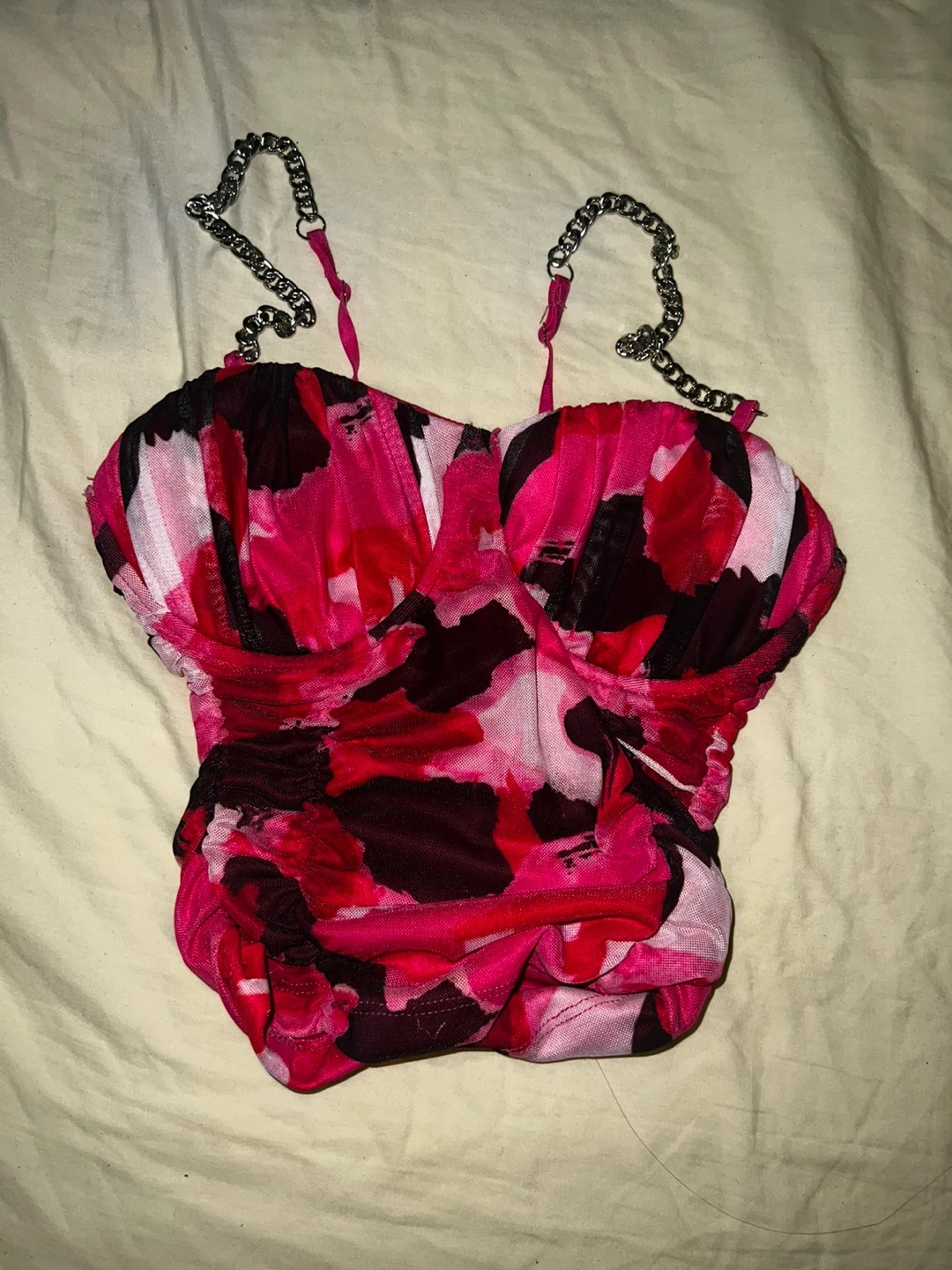 Selling a couple of cute corset tops! One is a pink floral pattern with chain straps, and the other is black. Both are in great condition and perfect for a night out