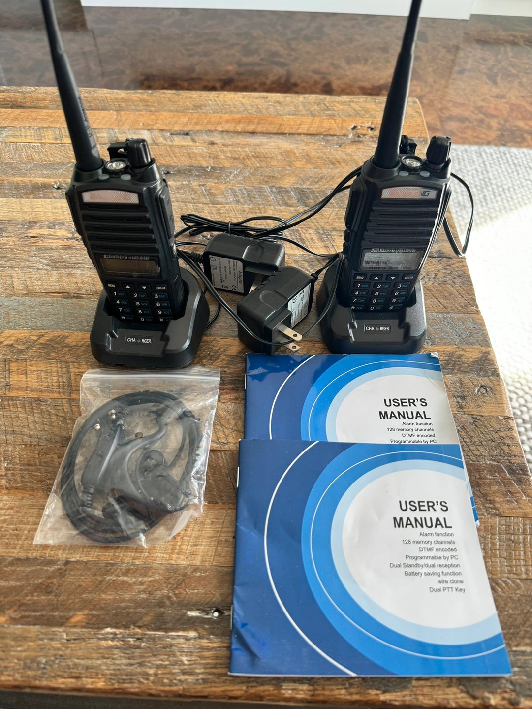 They come with chargers, user manuals, and 1 ear piece set.