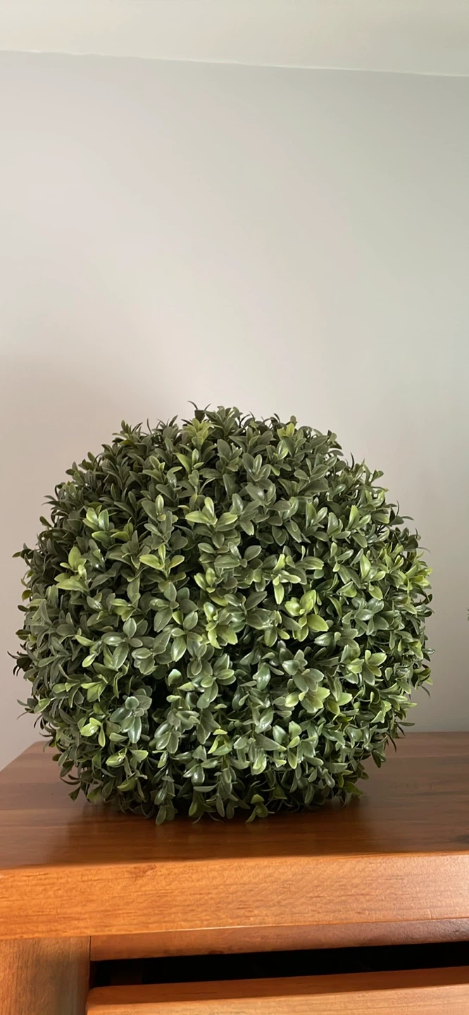 A faux green boxwood topiary ball plant. 12 inch diameter. Excellent used condition.