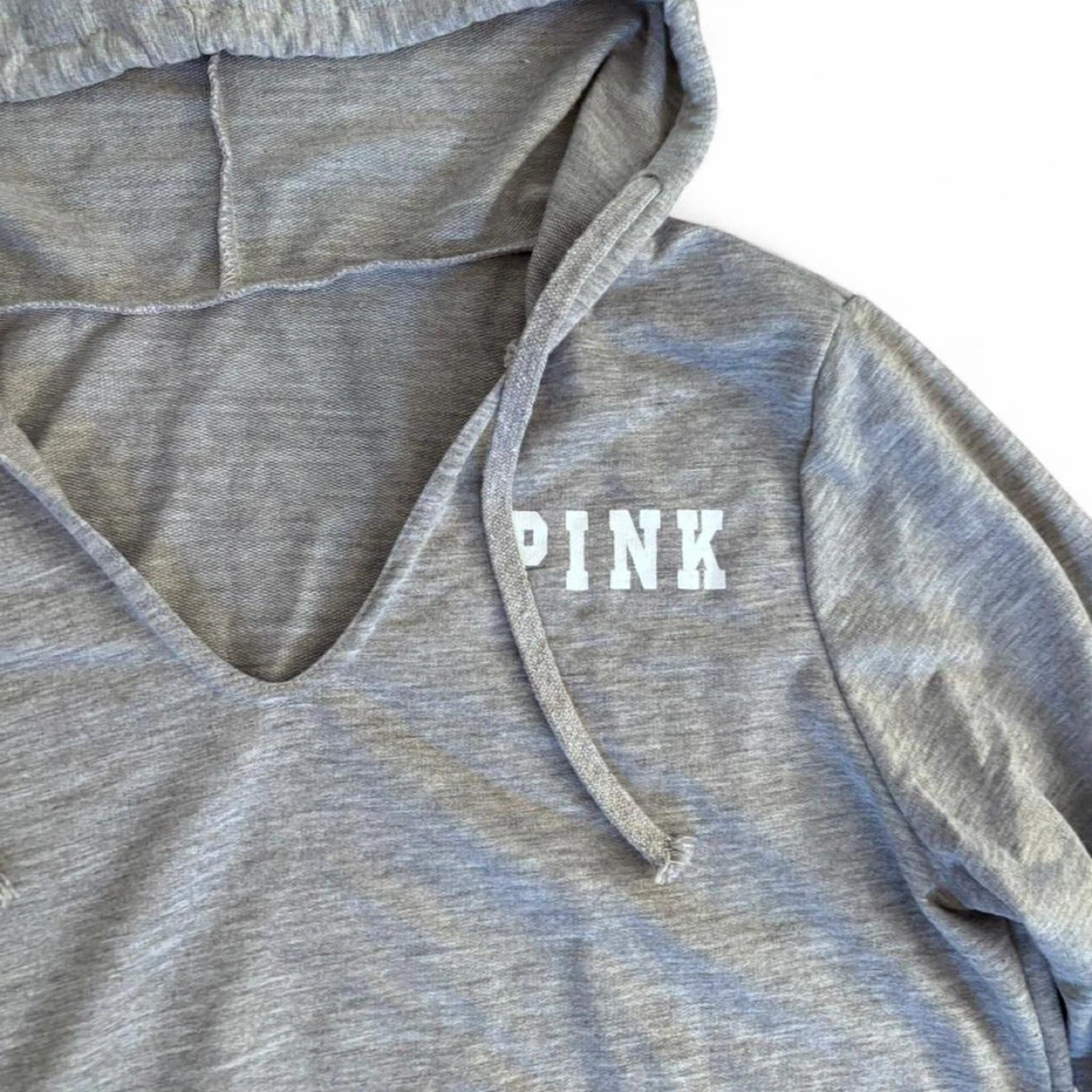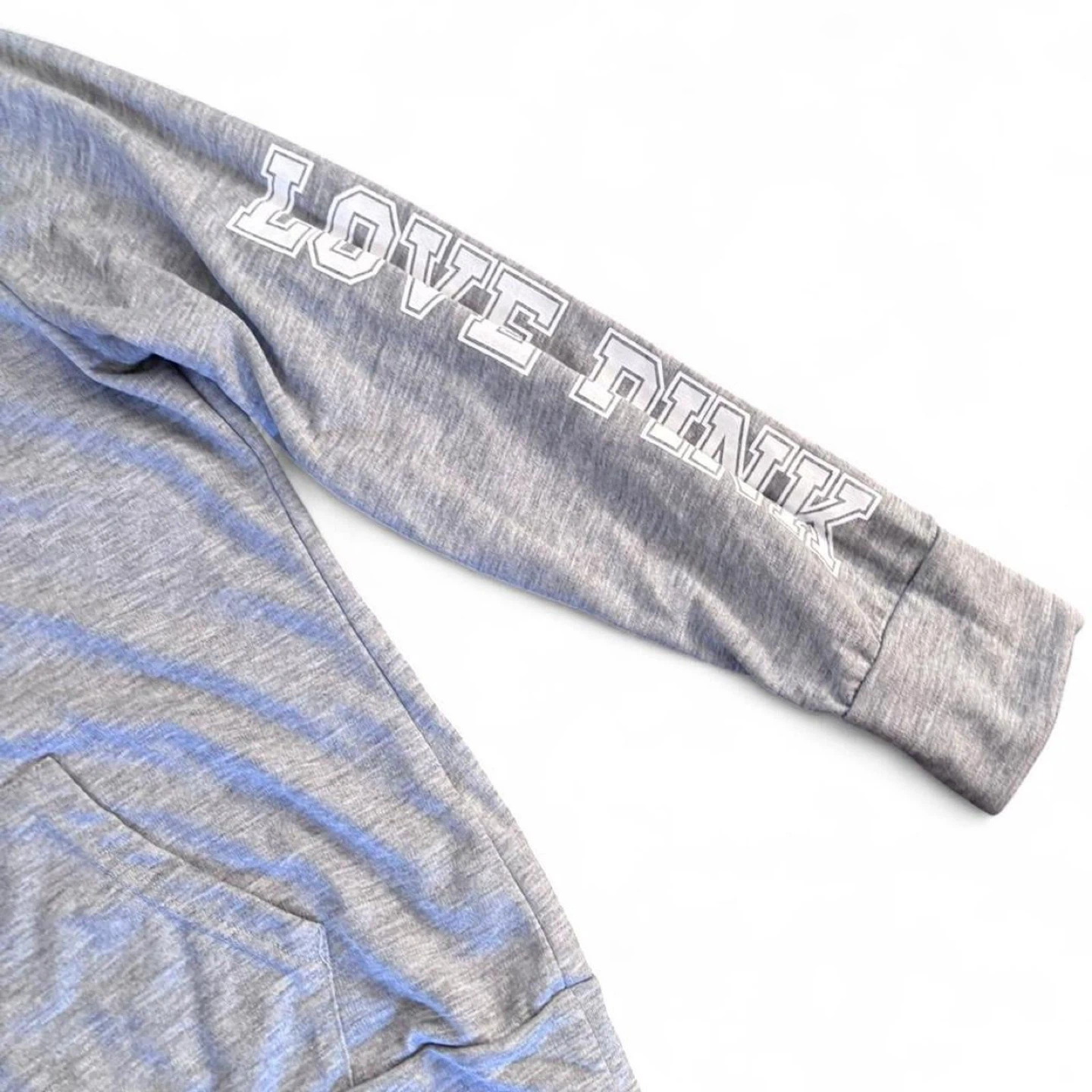 This is a grey PINK hoodie from Victoria's Secret. It's a comfortable pullover with a V-neck and a front kangaroo pocket. The "LOVE PINK" graphic is on the left sleeve. This hoodie is perfect for casual wear and lounging.