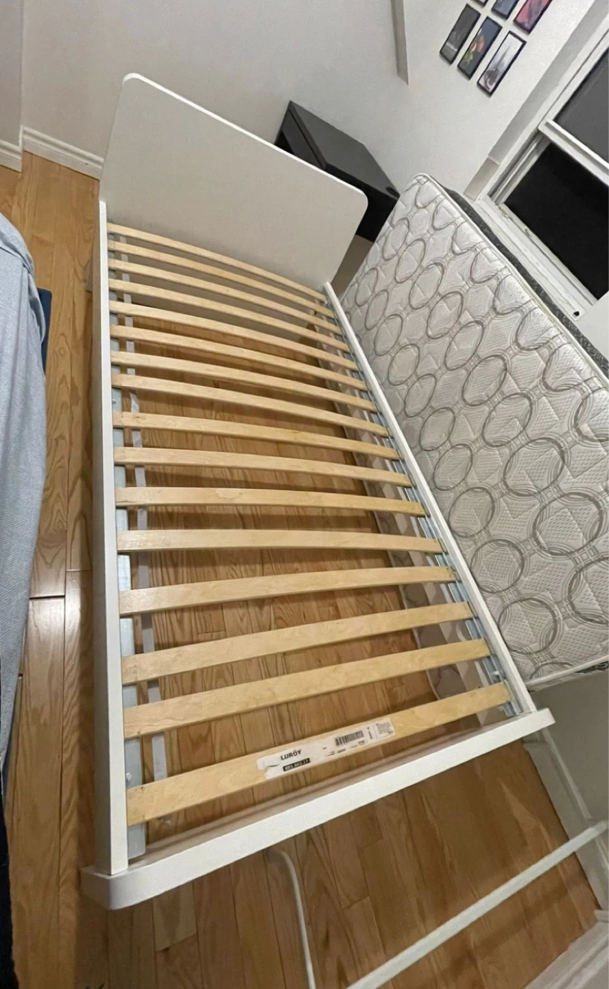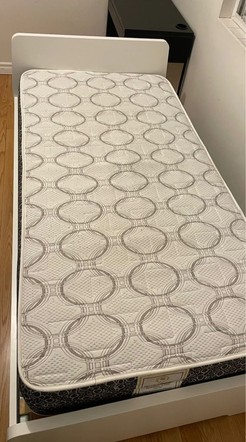 This is a white single bed frame with a slatted base. A comfortable mattress is included. Perfect for a child's room or guest space!