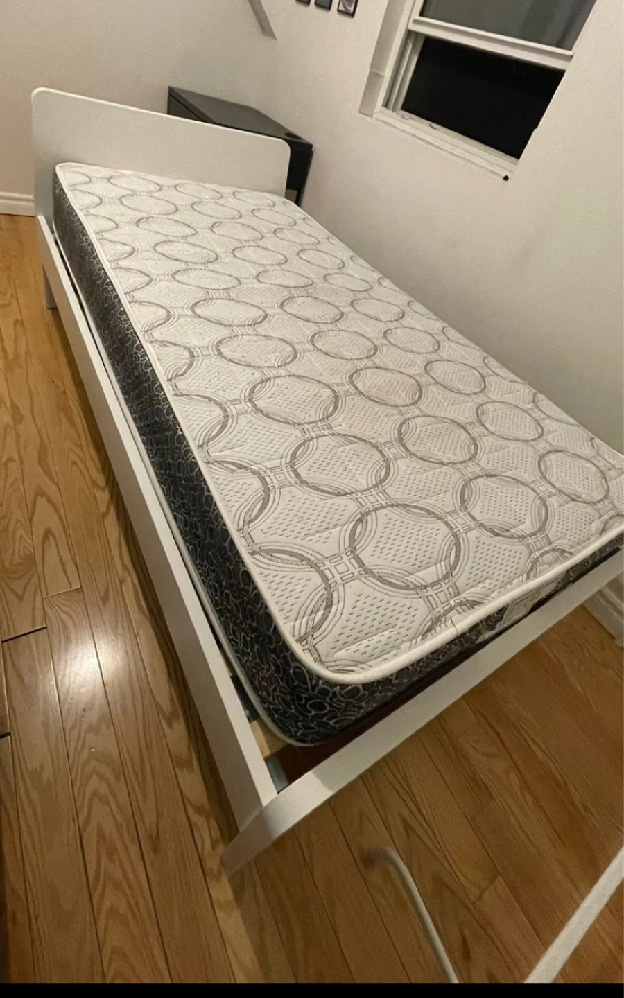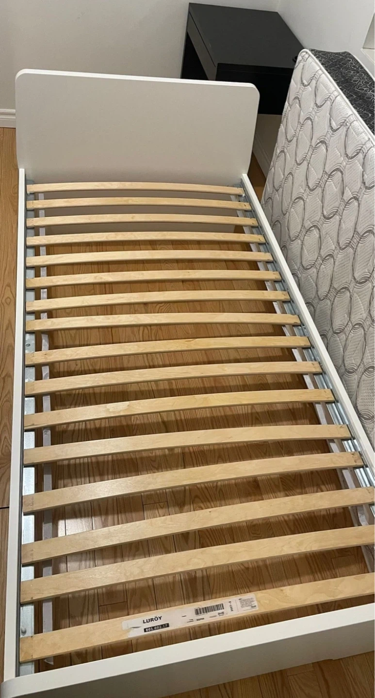 This is a white single bed frame with a slatted base. A comfortable mattress is included. Perfect for a child's room or guest space!