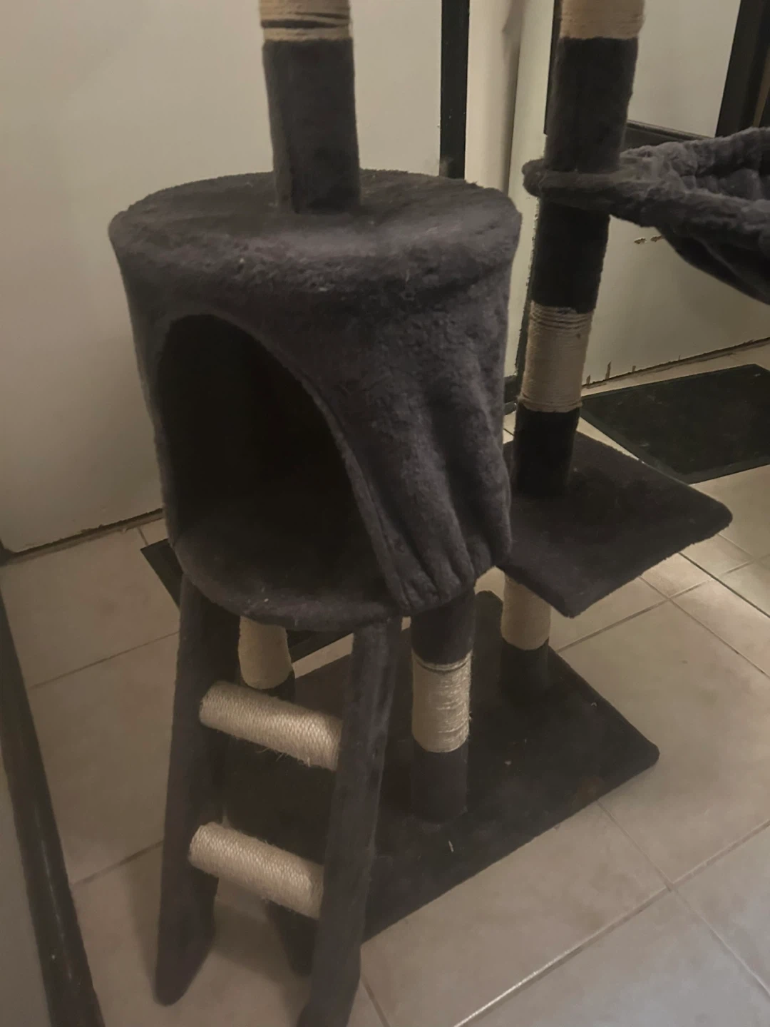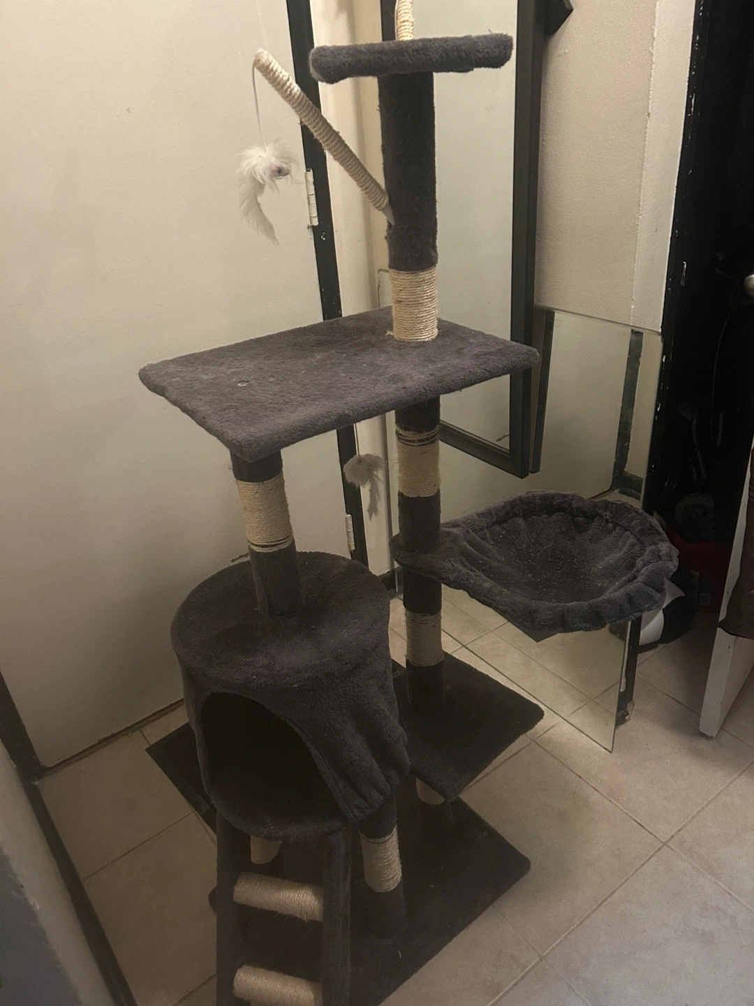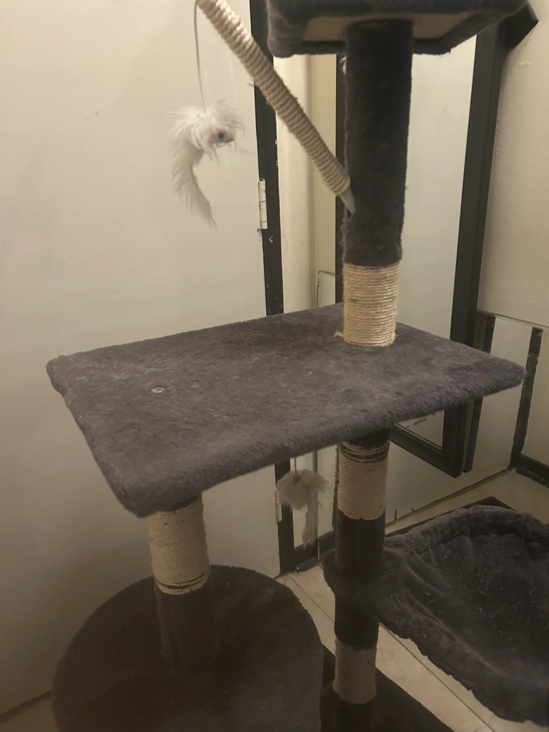This grey cat tree is about 4 feet high, great for smaller cats or kittens. Has a cozy hideout + 3 dangling mice. My cats outgrew it.