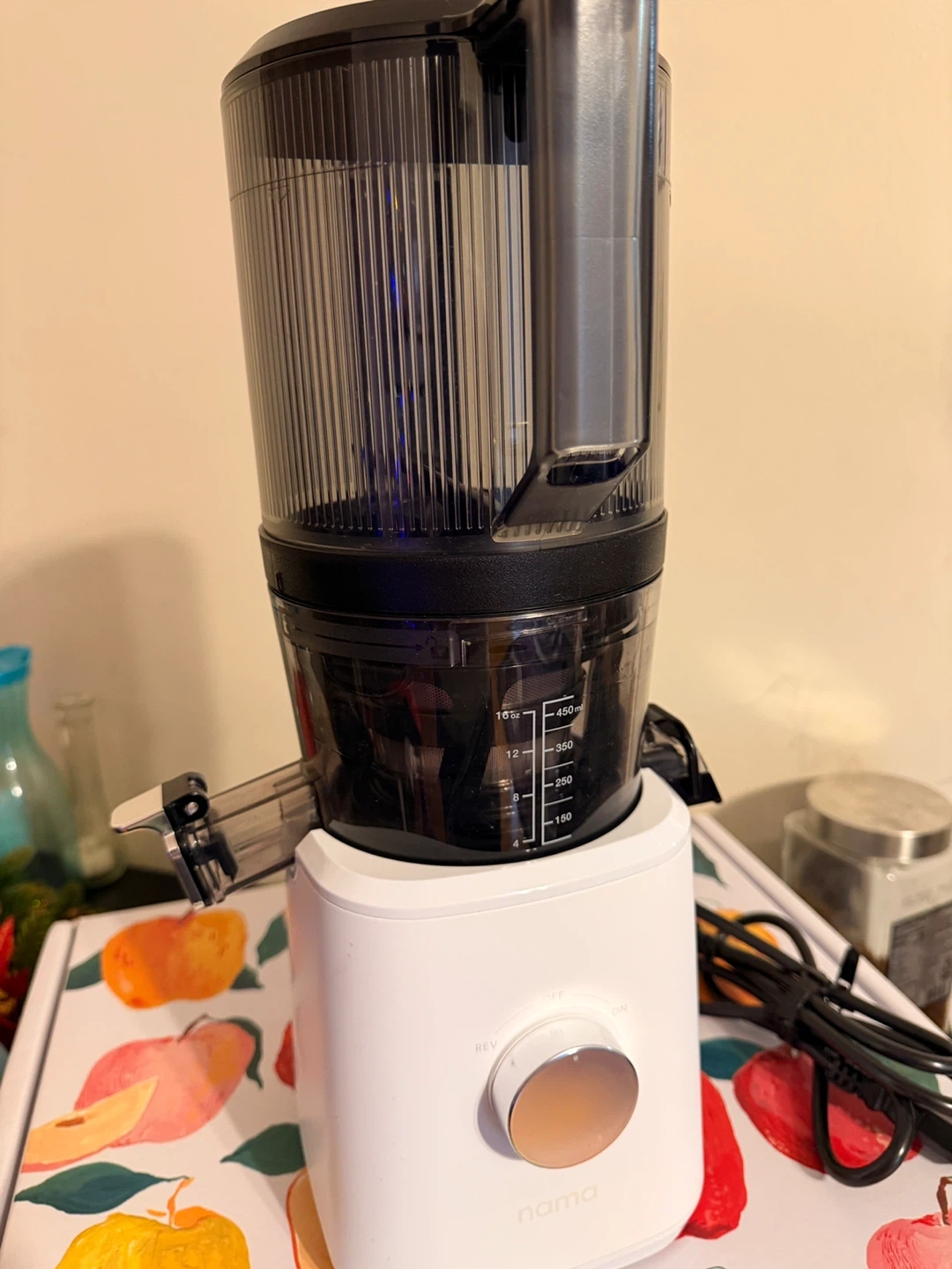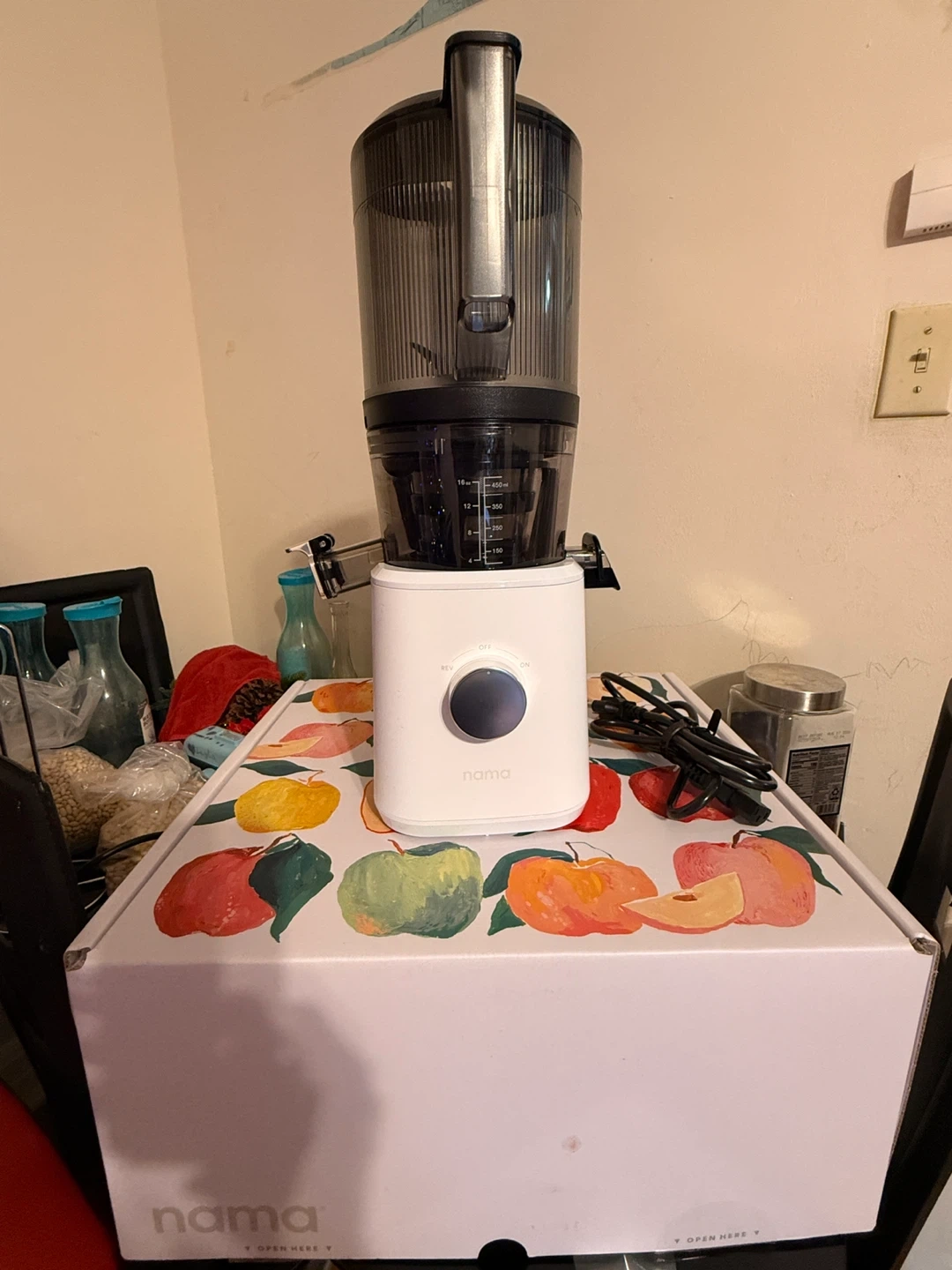 Selling a Nama J2 Cold Press Juicer! It comes with the box. This juicer is perfect for making healthy and delicious juices at home. It's in great condition and ready to use. No cup comes with.