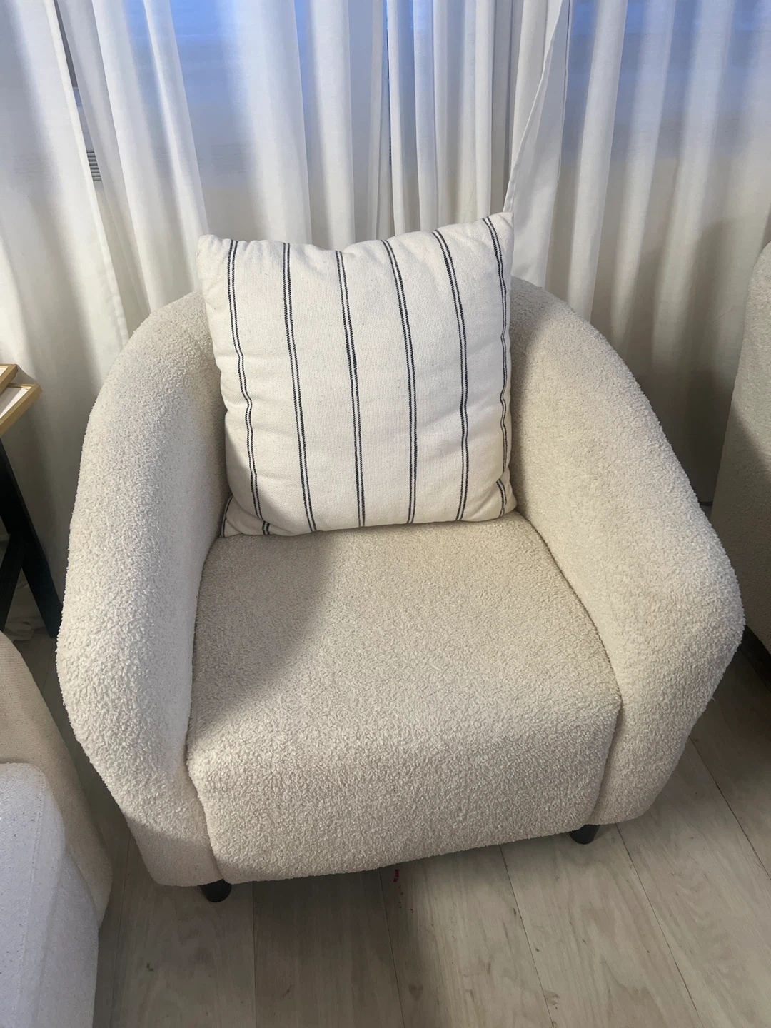 Comfortable accent armchair with a textured bouclé fabric. It has a rounded design and dark, short legs. A striped throw pillow is included with the chair. Two available