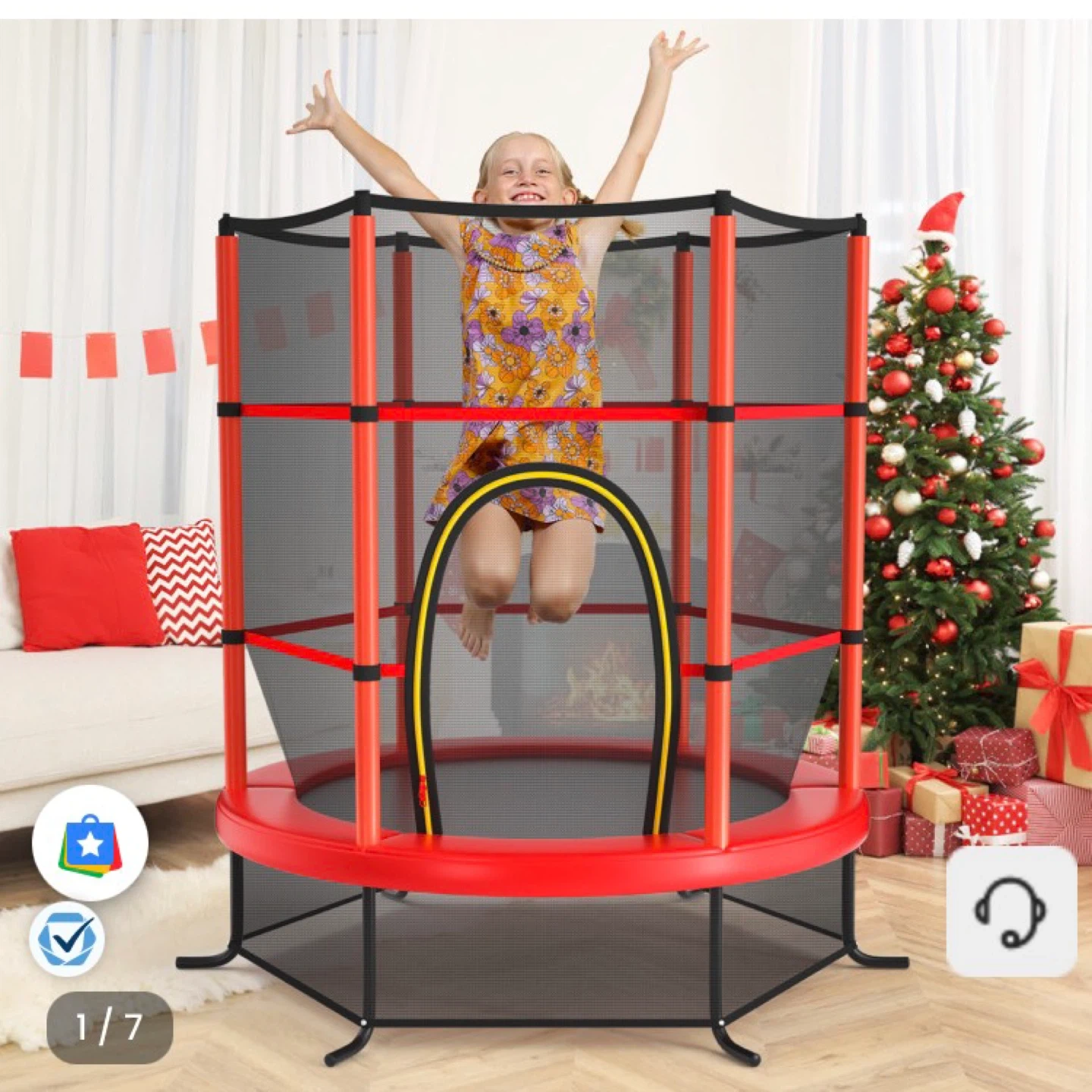 This trampoline is designed for children's indoor or outdoor fun. It features a safety enclosure net to keep jumpers secure. Assembly required from parts in the box.55 inch wide.