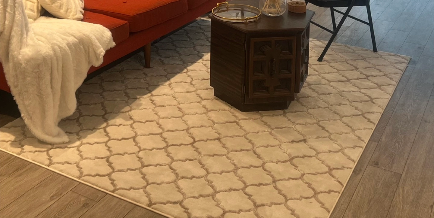 Selling a gently used area rug with a neutral pattern. It's in good condition and would look lovely in any room. Perfect for adding a touch of warmth and style to your home!