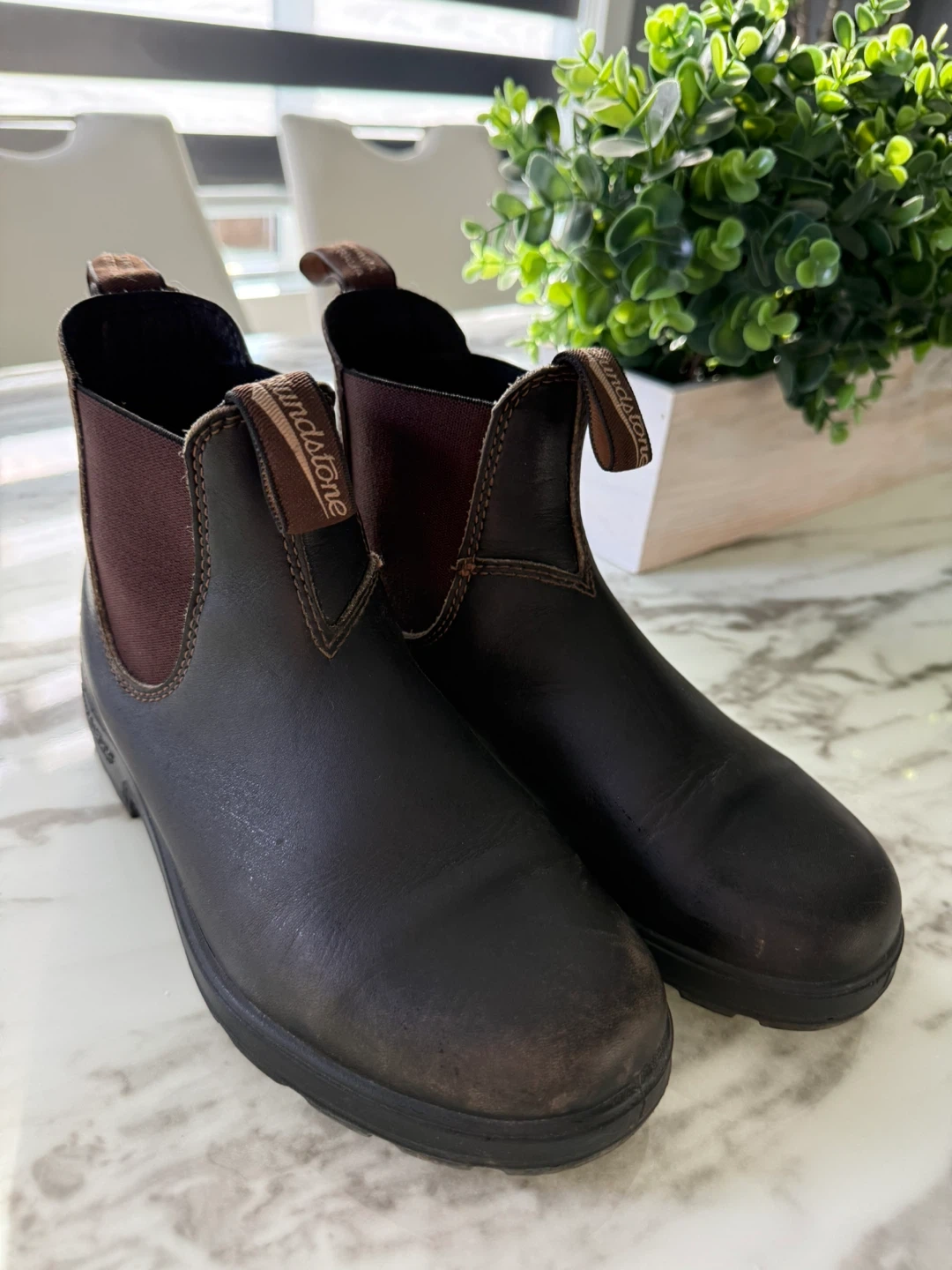 Classic Blundstone Chelsea boots in brown leather. These slip-on boots have elasticated side panels and pull tabs at the front and back. Durable rubber sole.