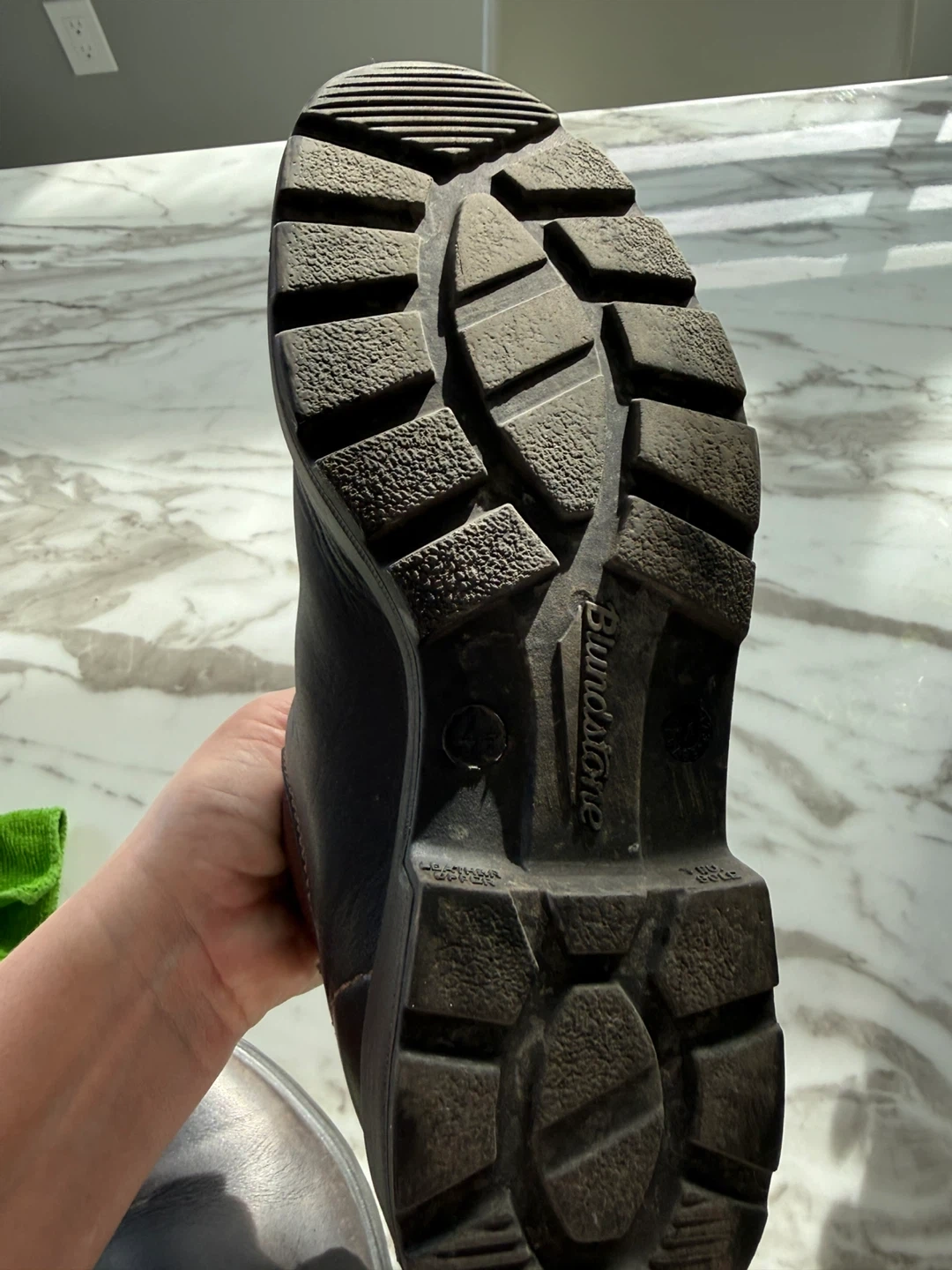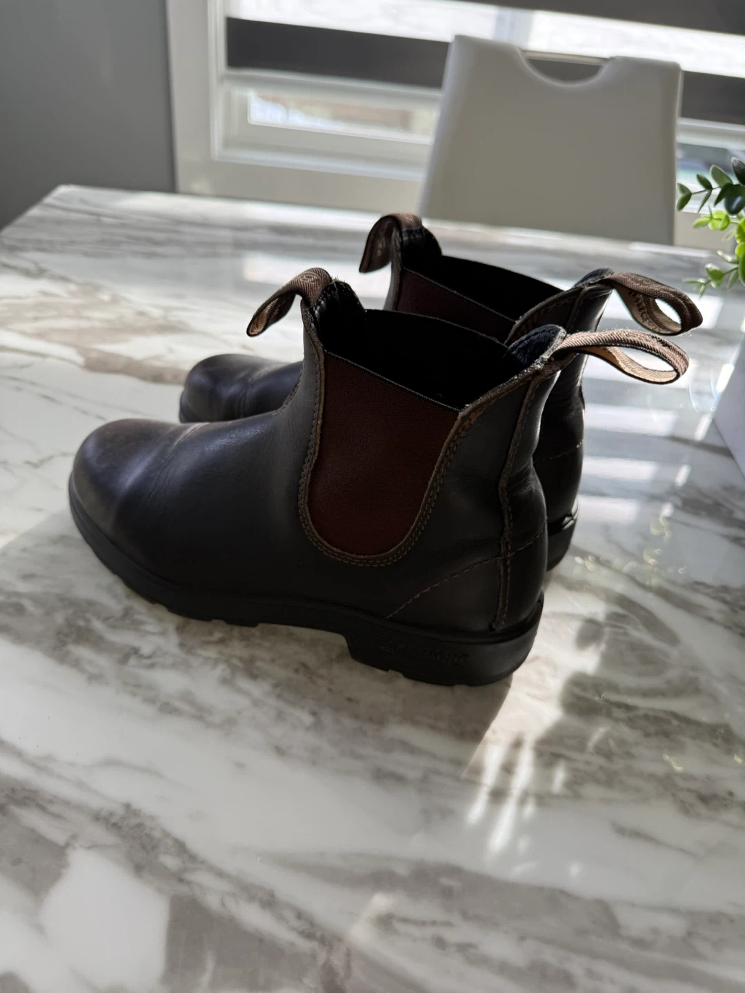 Classic Blundstone Chelsea boots in brown leather. These slip-on boots have elasticated side panels and pull tabs at the front and back. Durable rubber sole.
