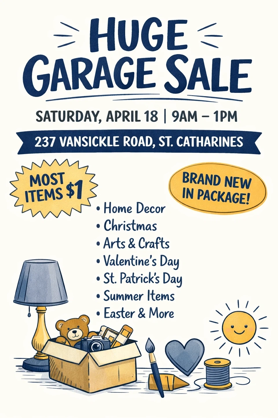 Garage sale happening Saturday, April 18 from 9 AM to 1 PM. Located at 237 Vansickle Road in St. Catharines. Most items are $1 and many are brand new in package! A wide variety of items including home decor, Christmas, arts & crafts, and more.