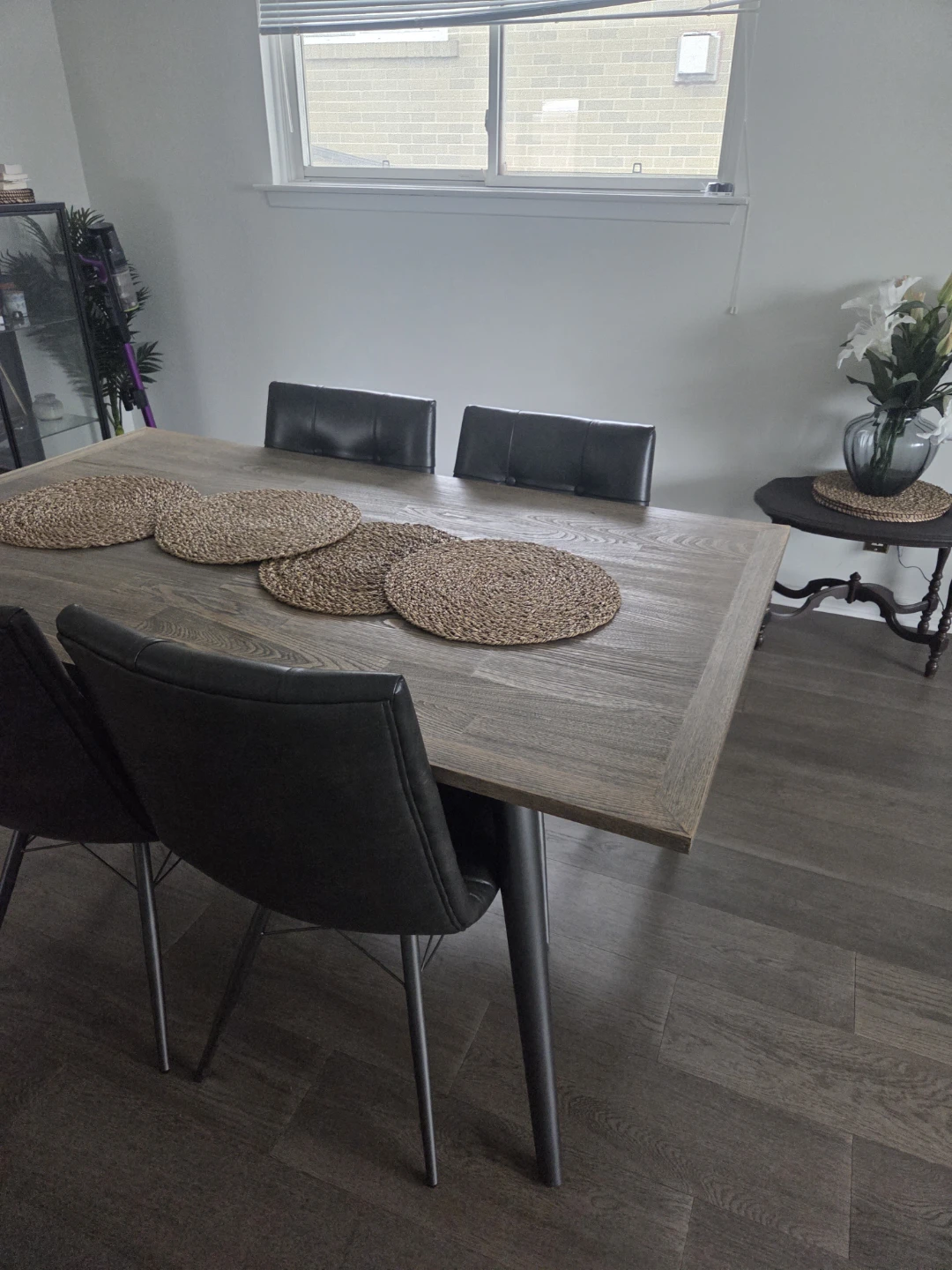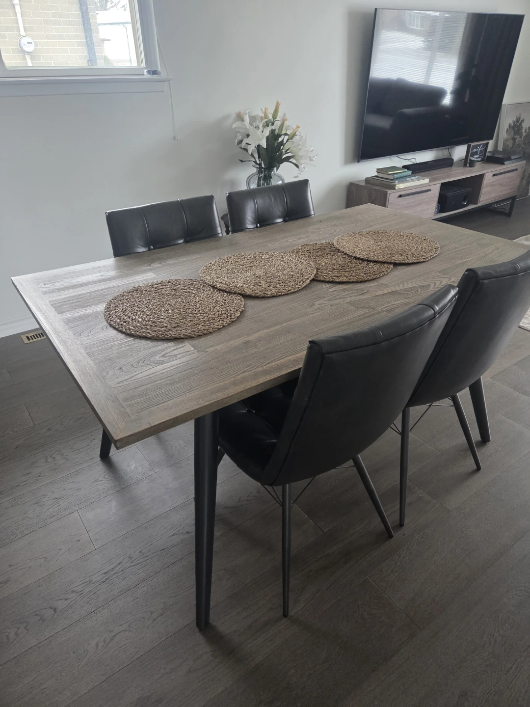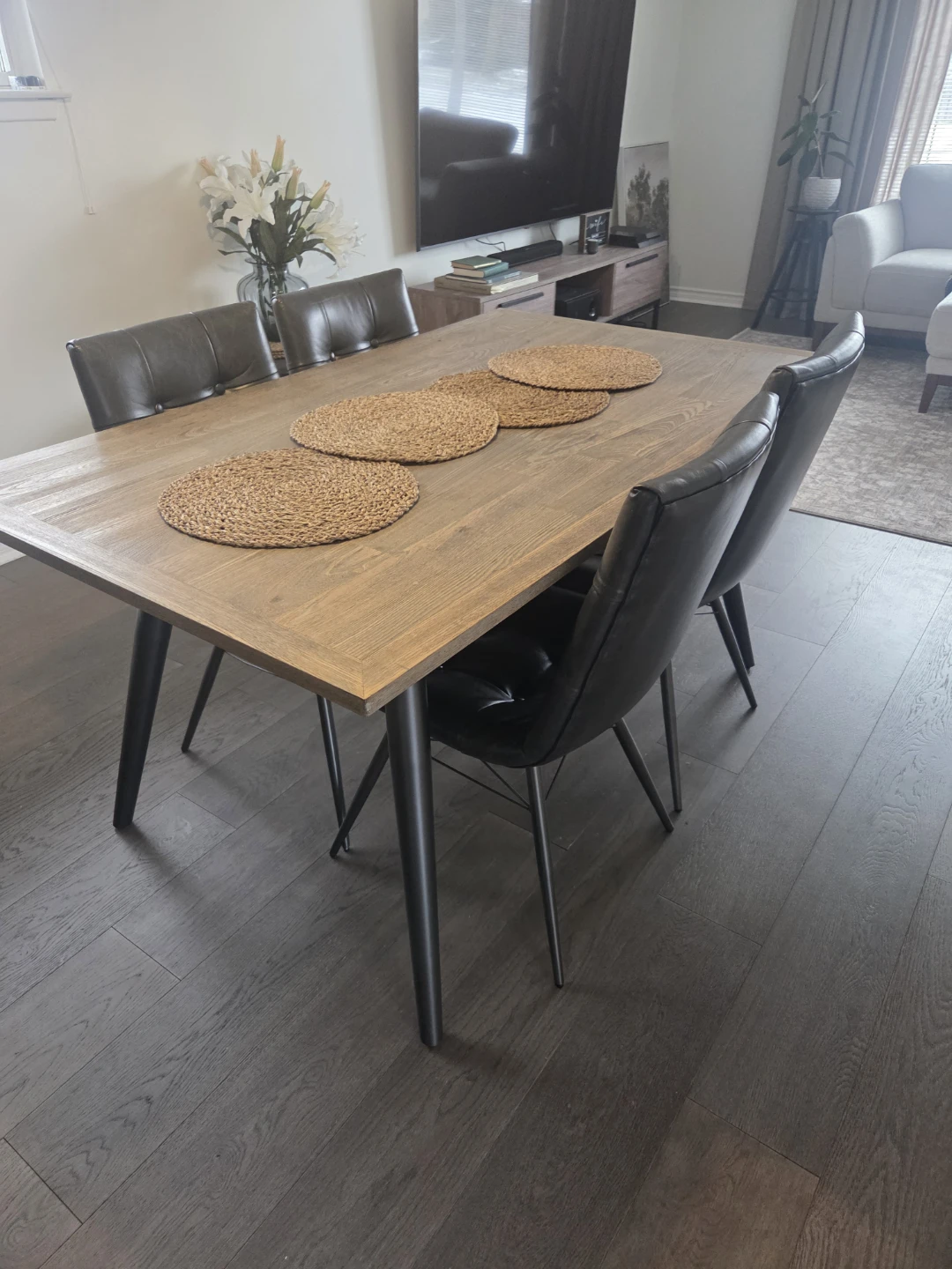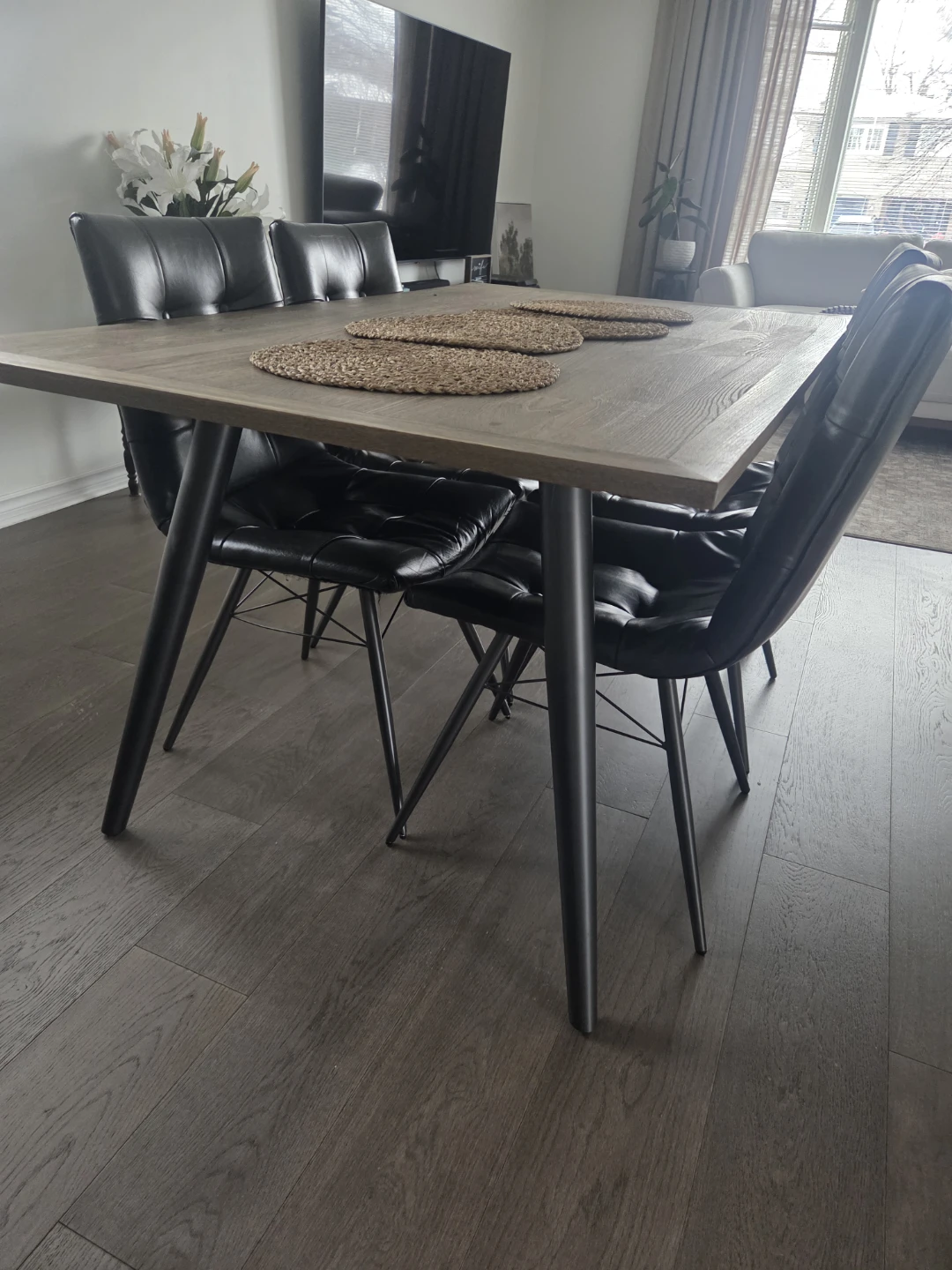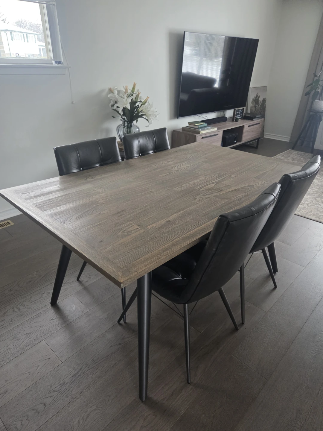 This is a modern dining table. It features a wood tabletop with black metal legs.