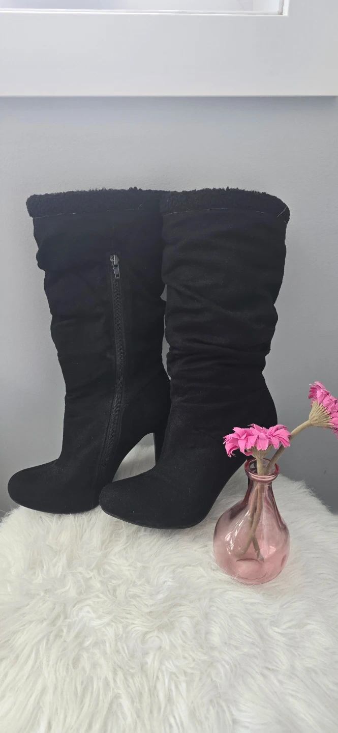 These black slouch boots feature a suede-like finish and a comfortable fit. They have a side zipper for easy on and off. Heel height is approximately 4 inches, size 8