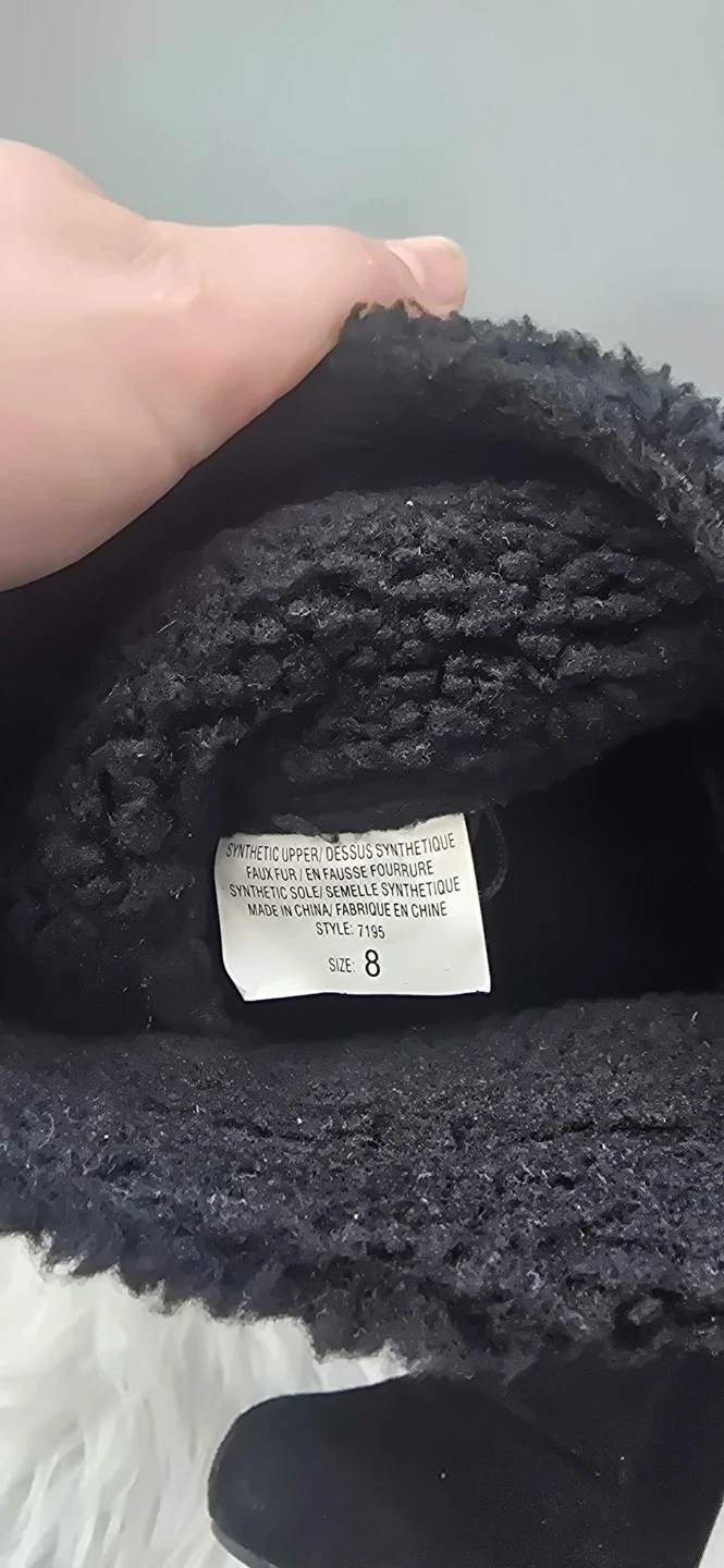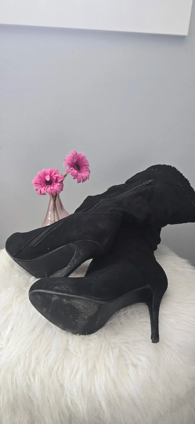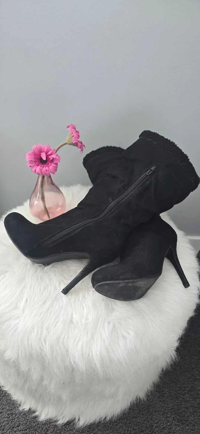 These black slouch boots feature a suede-like finish and a comfortable fit. They have a side zipper for easy on and off. Heel height is approximately 4 inches, size 8