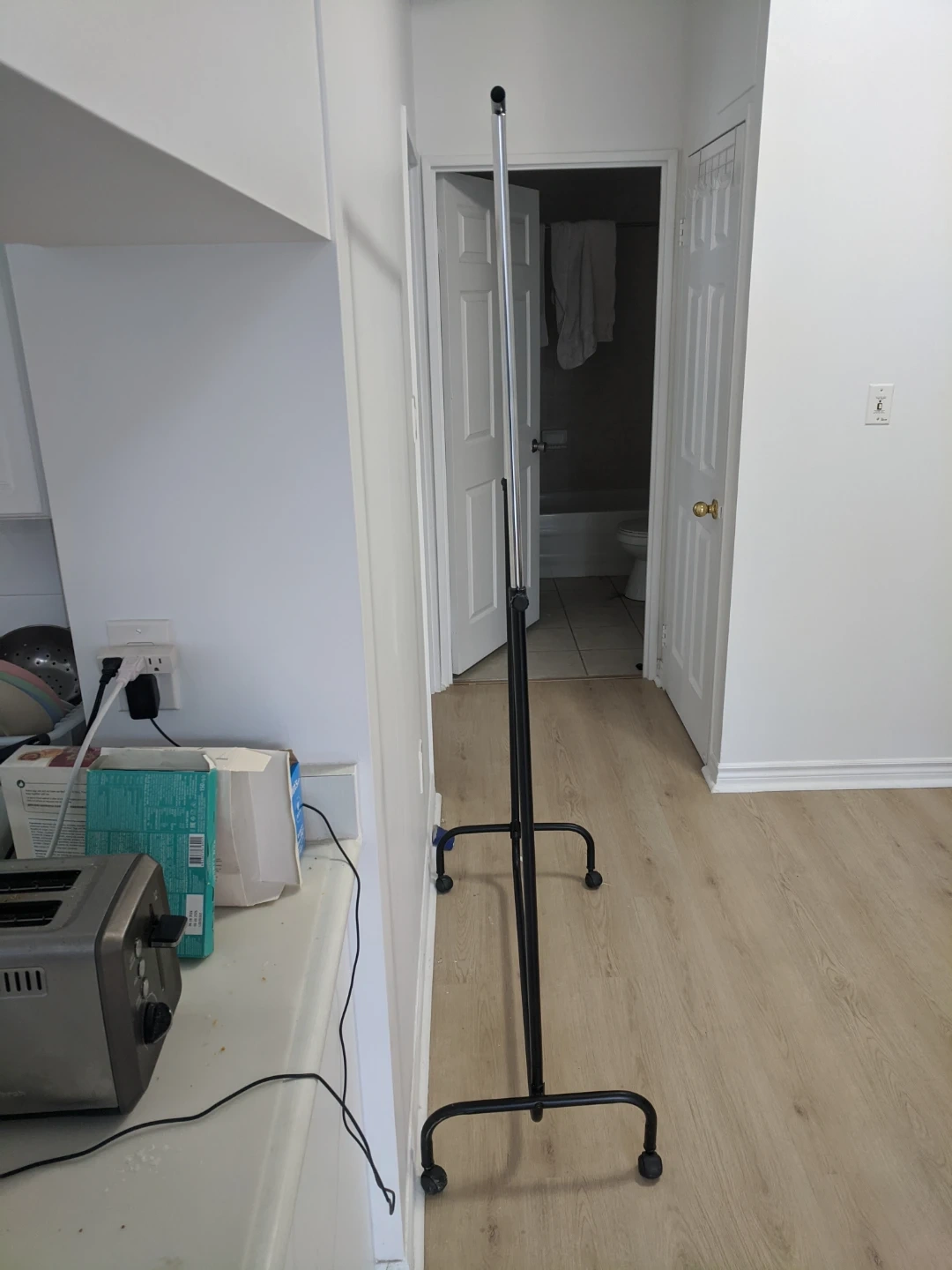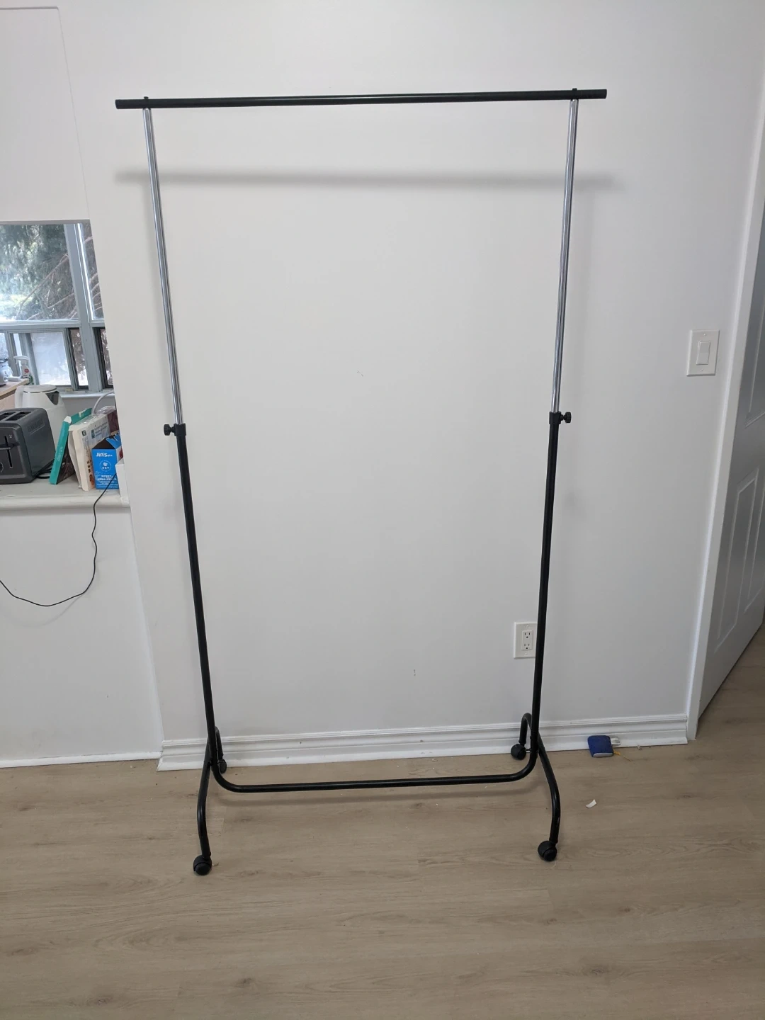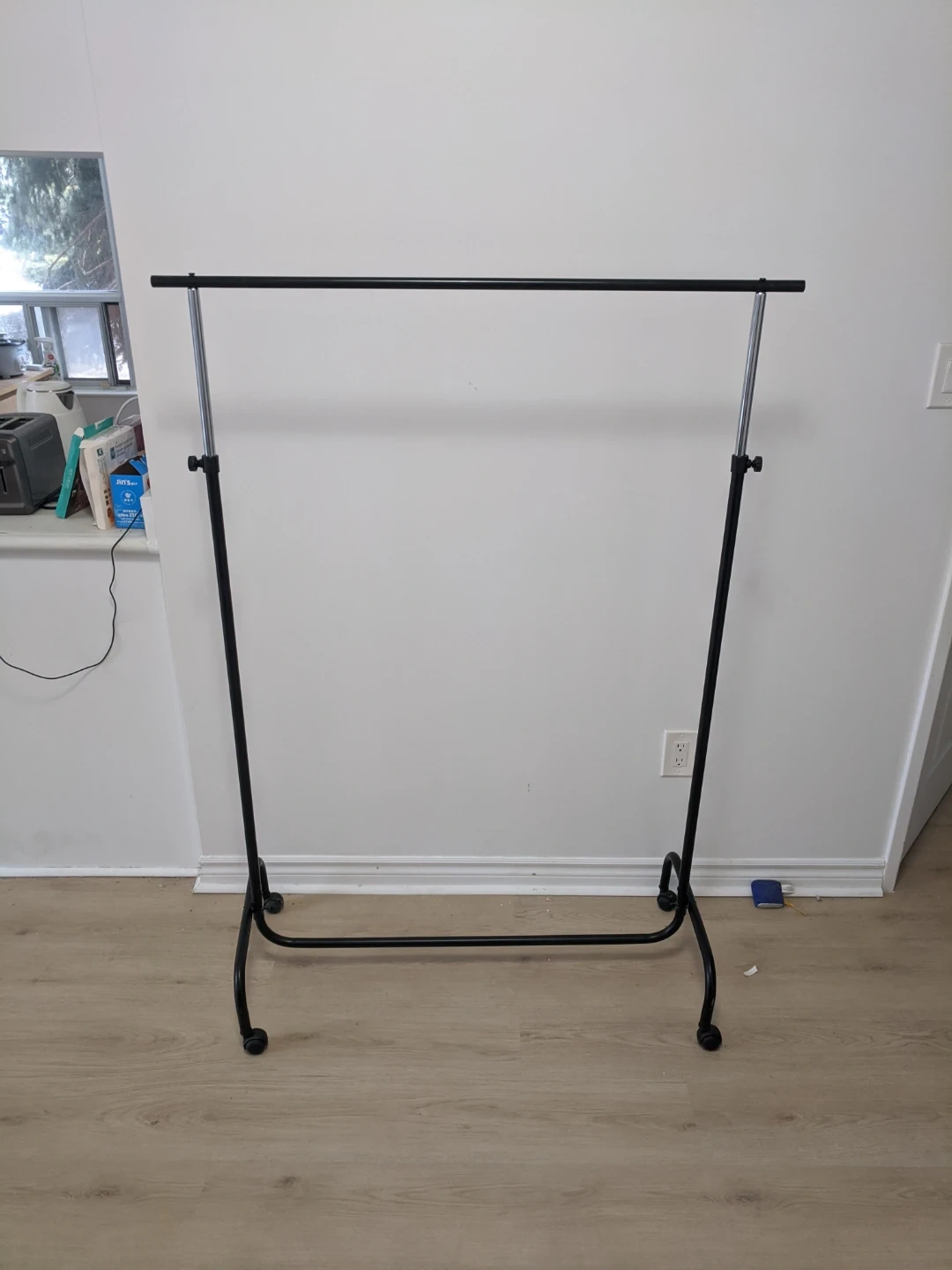 This rolling garment rack offers ample space for hanging clothes. It features an adjustable height and wheels for easy transport and stability. Black metal frame and silver bars.