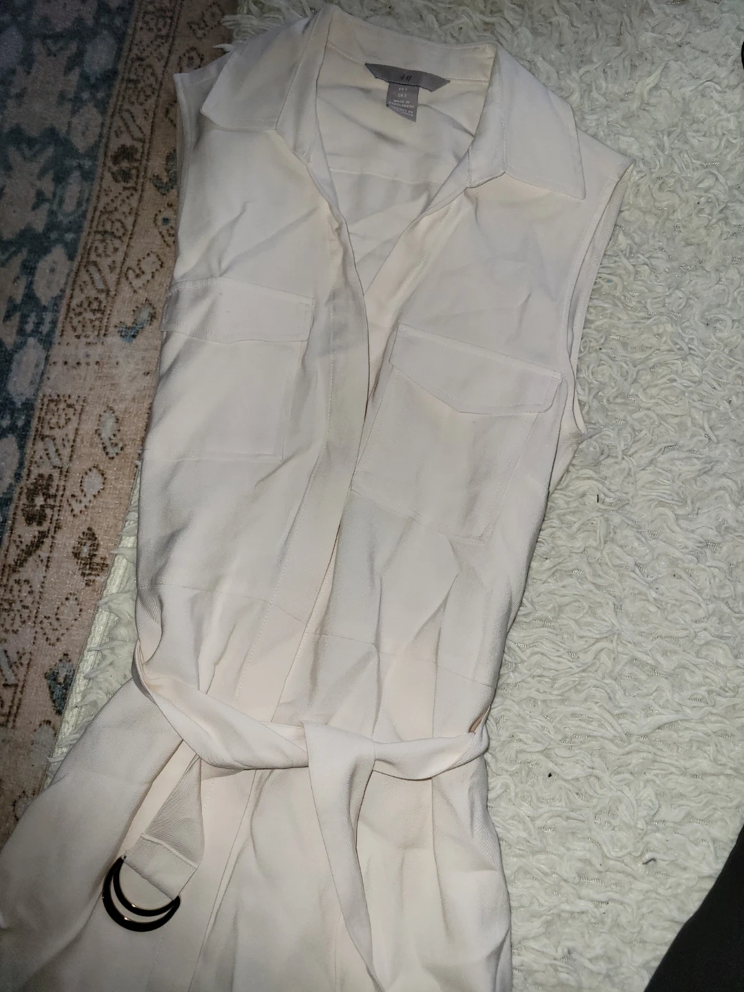 Two stylish sleeveless dresses. The white dress features a utility-inspired design with pockets and a tie waist. The black skater dress is a classic fit and flare style. Both are great for various occasions!