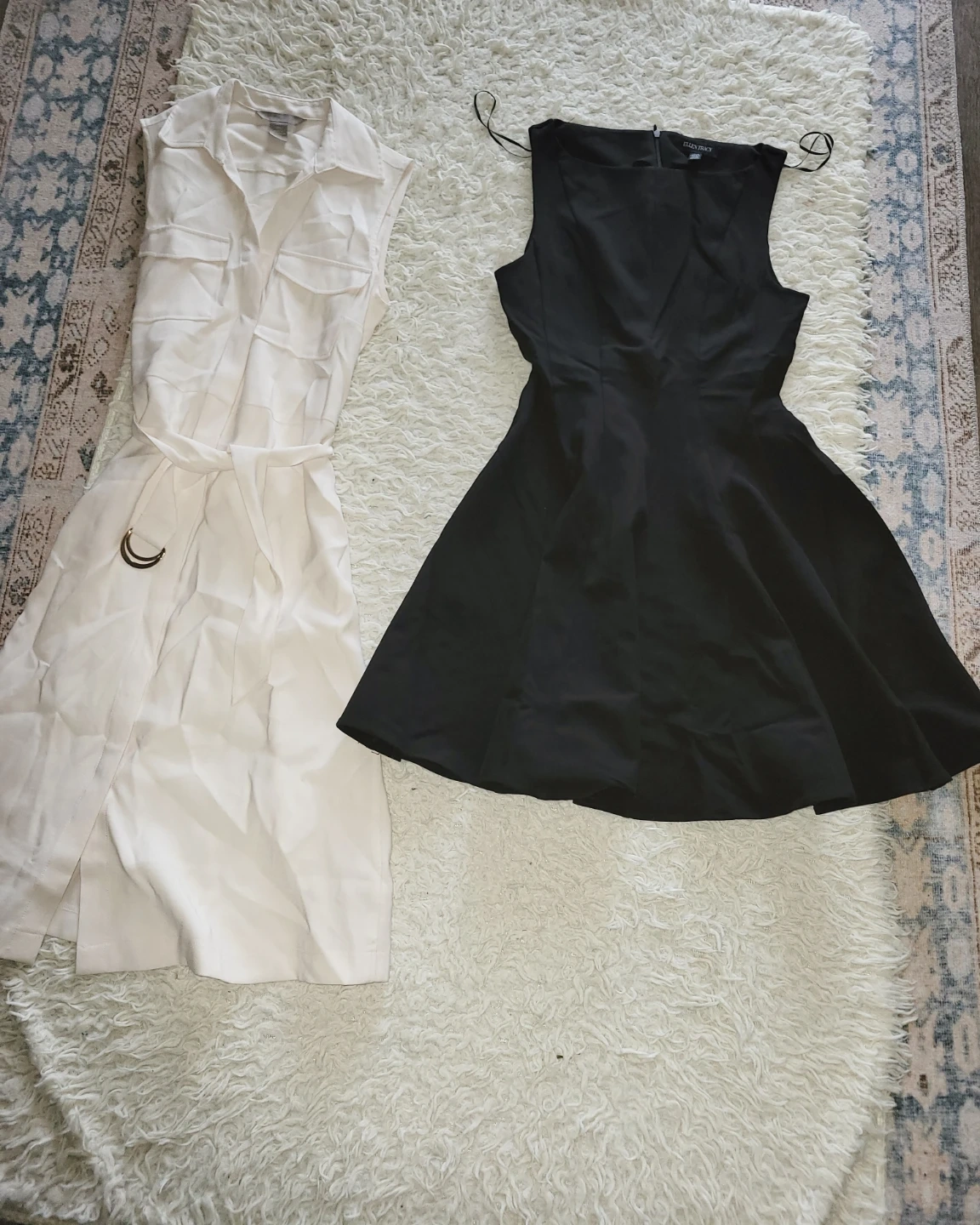 Two stylish sleeveless dresses. The white dress features a utility-inspired design with pockets and a tie waist. The black skater dress is a classic fit and flare style. Both are great for various occasions!