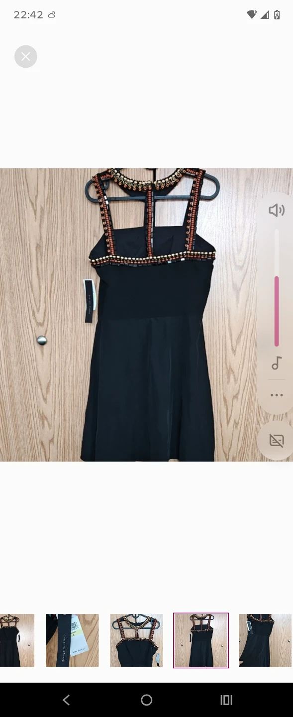 Elegant black dress with intricate beaded neckline and straps. It features a flattering A-line skirt with subtle pleats. Perfect for a special occasion or a night out!