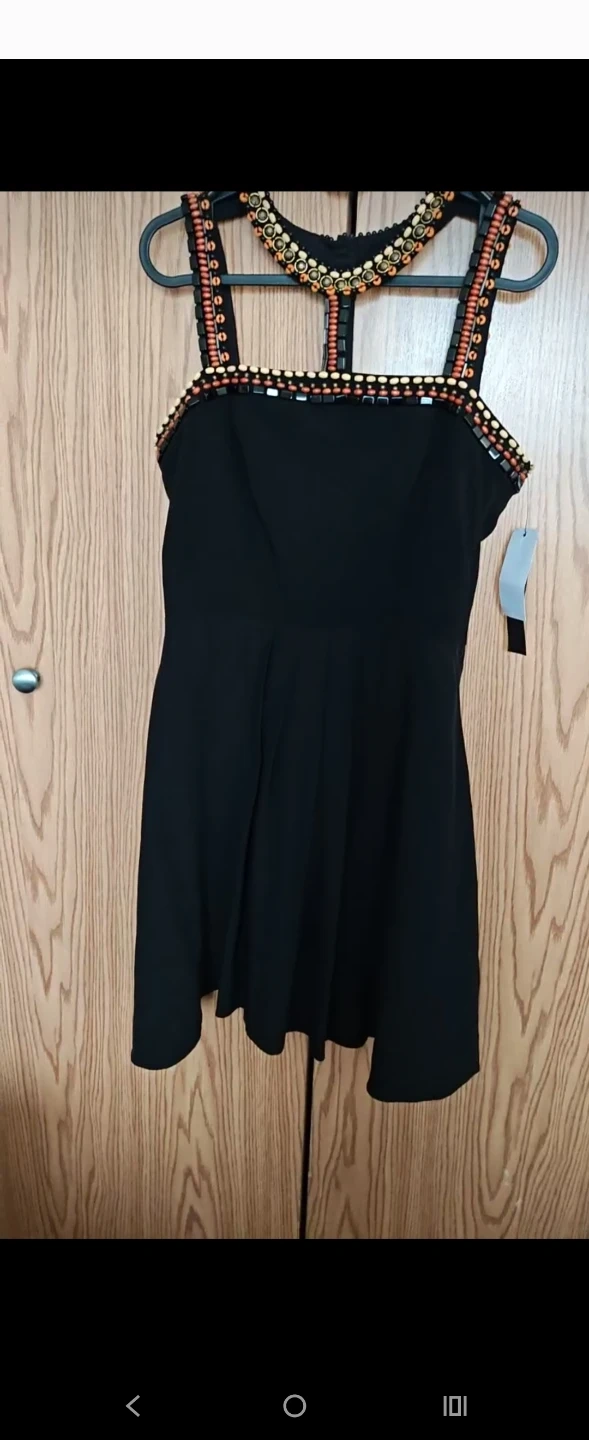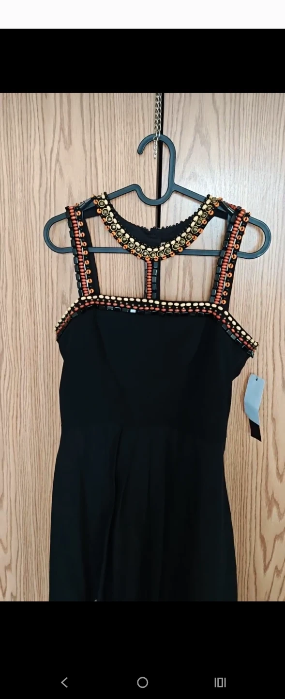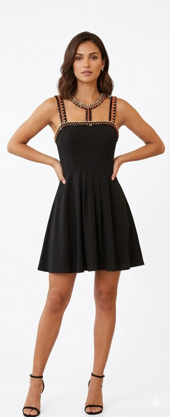 Elegant black dress with intricate beaded neckline and straps. It features a flattering A-line skirt with subtle pleats. Perfect for a special occasion or a night out!